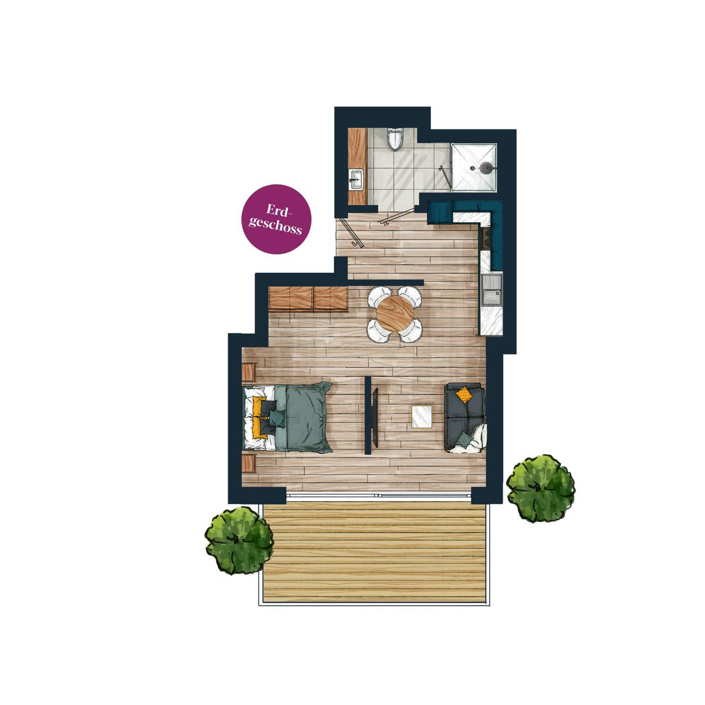 Die durchdachte Ausstattung des ca. 54 m² großen 1-Zimmer-Apartments schafft ein einzigartiges Wohngefühl und bietet Platz für bis zu zwei Gäste.