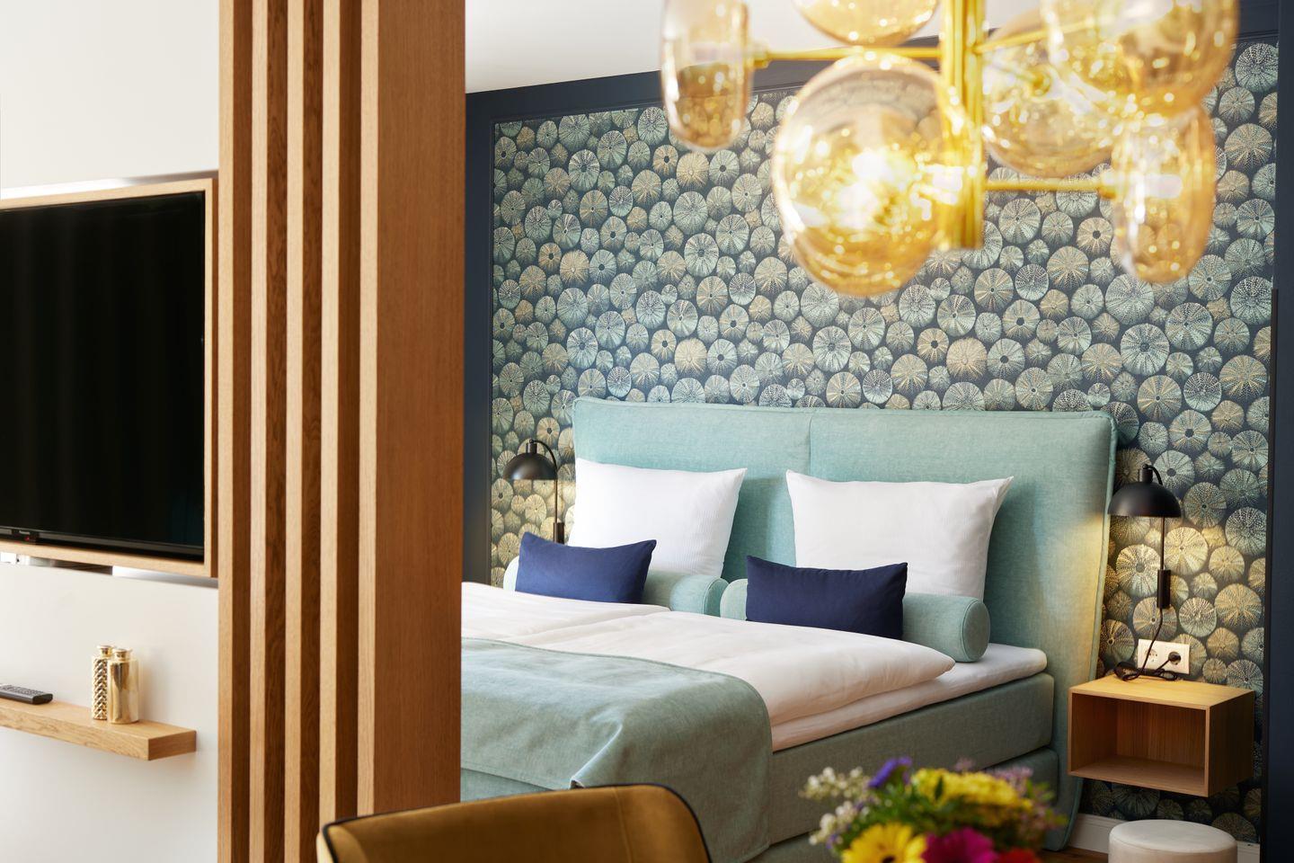 Die durchdachte Ausstattung des ca. 55 m² großen 1-Zimmer-Apartments schafft ein einzigartiges Wohngefühl und bietet Platz für bis zu zwei Gäste. Der Wohn- und Essbereich mit integrierter Küche und Design-Polstermöbeln lädt zum gemütlichen Zusammensein ein und grenzt direkt an Ihre private Sonnenterrasse. Ein Highlight ist die hochwertige Küche mit türkisenen Fronten und goldenen Armaturen.