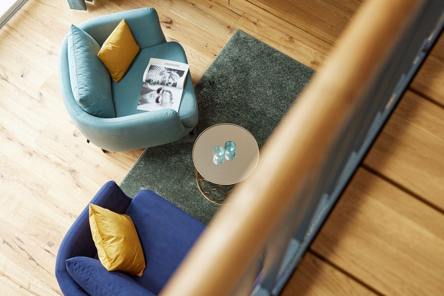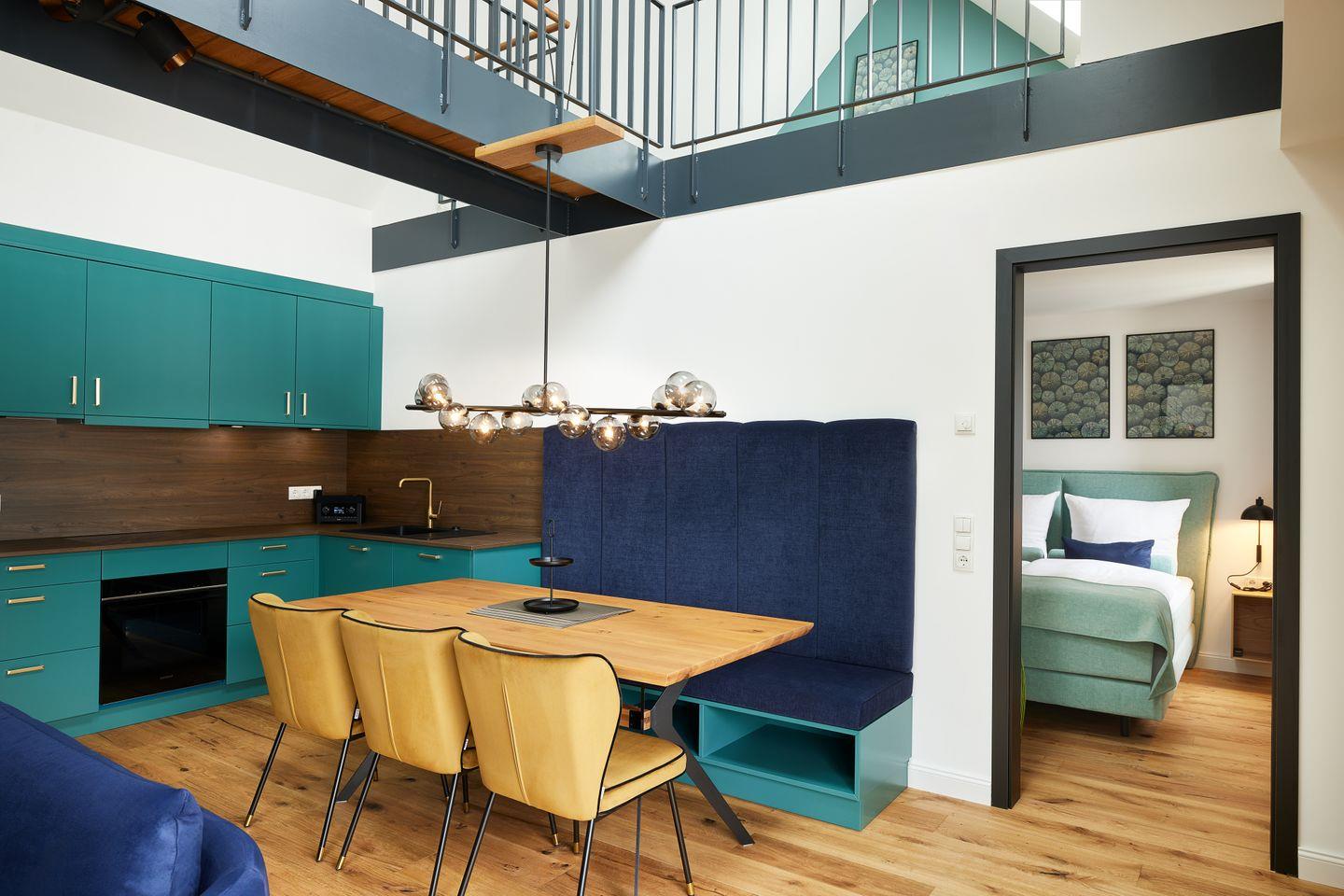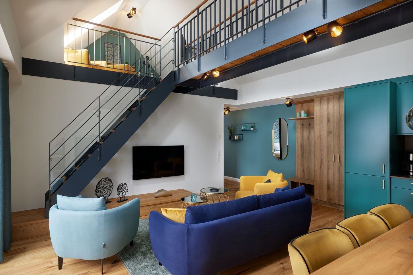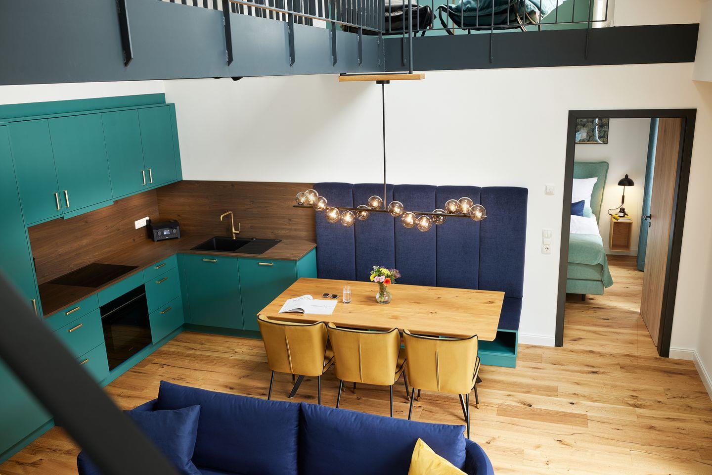 Das ca. 105 m² große Apartment versprüht ein einzigartiges Gefühl von Freiheit und Luxus. Der großzügige Wohn- und Essbereich mit integrierter Küche und Design-Polstermöbeln lädt zum gemütlichen Zusammensein ein und grenzt direkt an Ihren großen, privaten Balkon. Nicht nur die hochwertige Küche mit türkisfarbenen Fronten und goldenen Armaturen ist ein Highlight dieser Unterkunft: Über dem Wohnraum befinden sich ein Loungebereich auf zwei offenen Galerien, die über eine Brücke miteinander verbunden sind und zum Entspannen einladen.