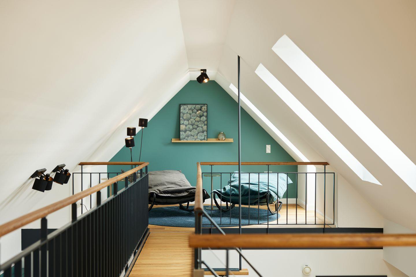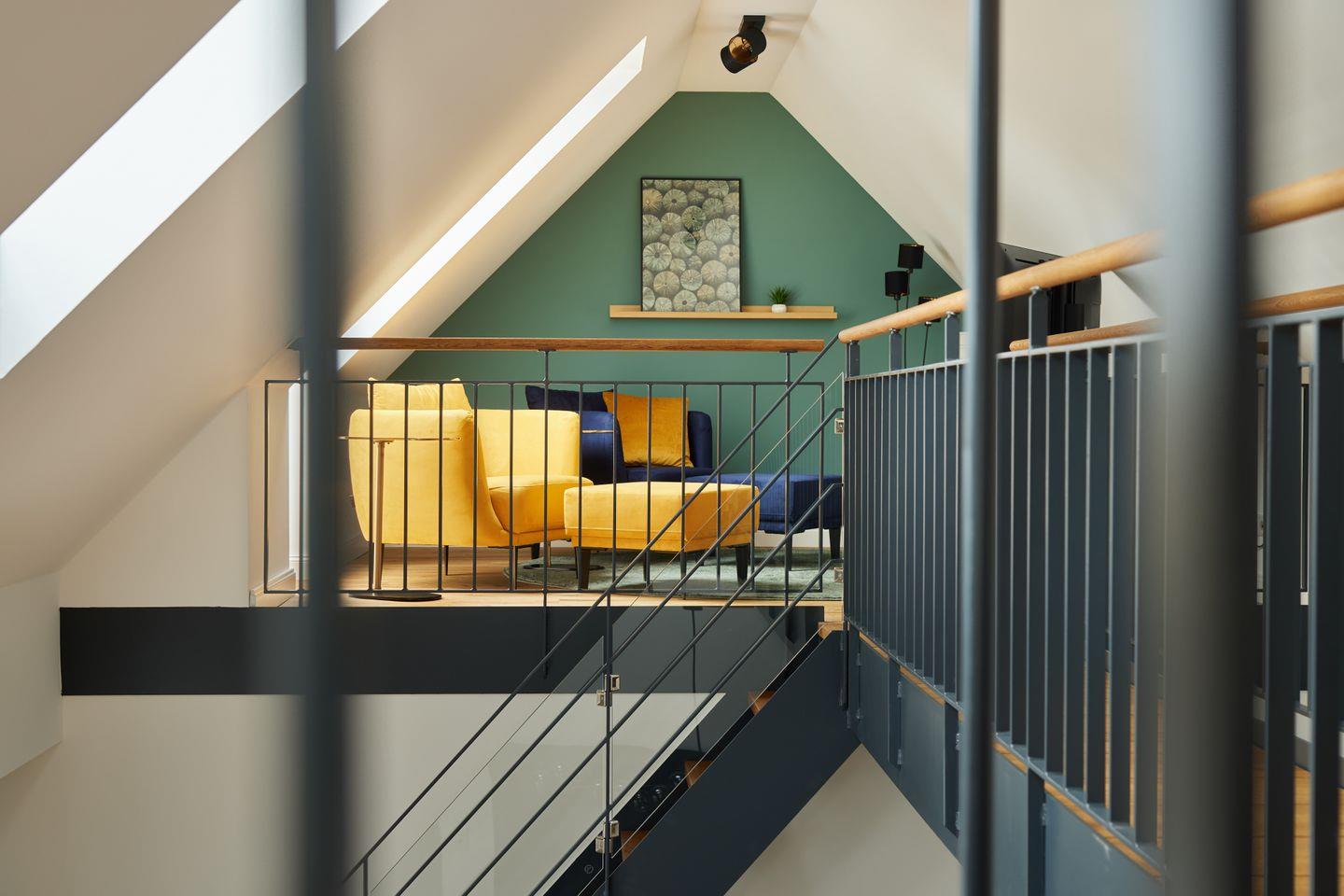 Nicht nur die hochwertige Küche ist ein Highlight dieser Unterkunft: Über dem Wohnraum befinden sich ein Loungebereich auf zwei offenen Galerien, die über eine Brücke miteinander verbunden sind und zum Entspannen einladen.