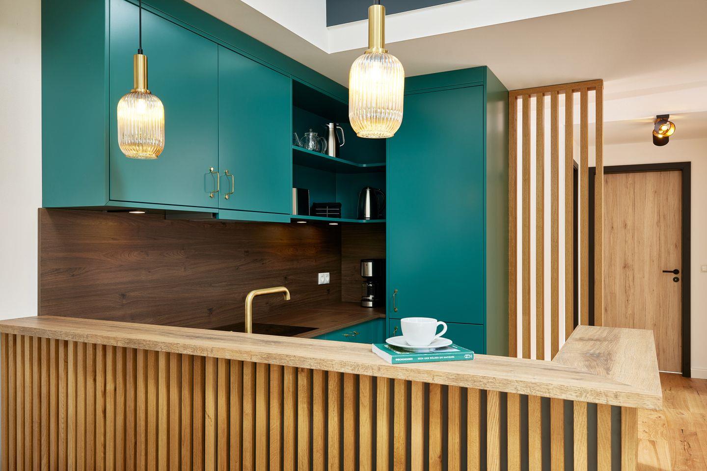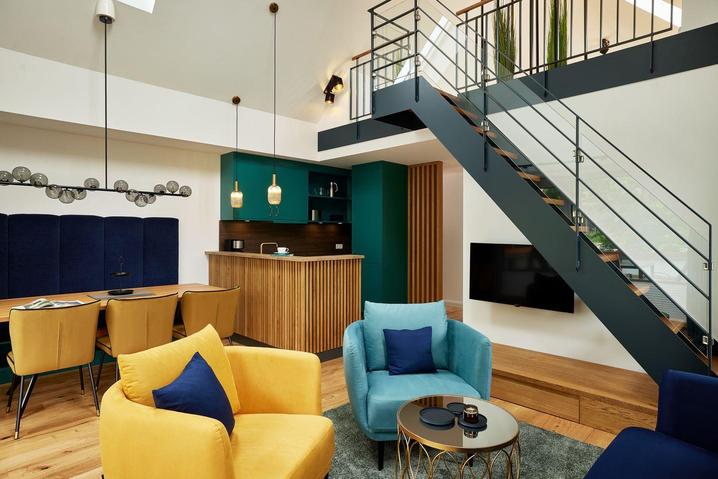 Auf einer Fläche von ca. 91 m² schafft das großzügige Apartment eine einzigartige Wohlfühlatmosphäre. Der Wohn- und Essbereich mit integrierter Küche und Design-Polstermöbeln lädt zum gemütlichen Zusammensein ein und grenzt direkt an Ihren privaten Sonnenbalkon. Nicht nur die hochwertige Küche mit türkisenen Fronten und goldenen Armaturen ist ein Highlight: über dem Wohnbereich befindet sich eine offene Galerie, die zum Entspannen einlädt.