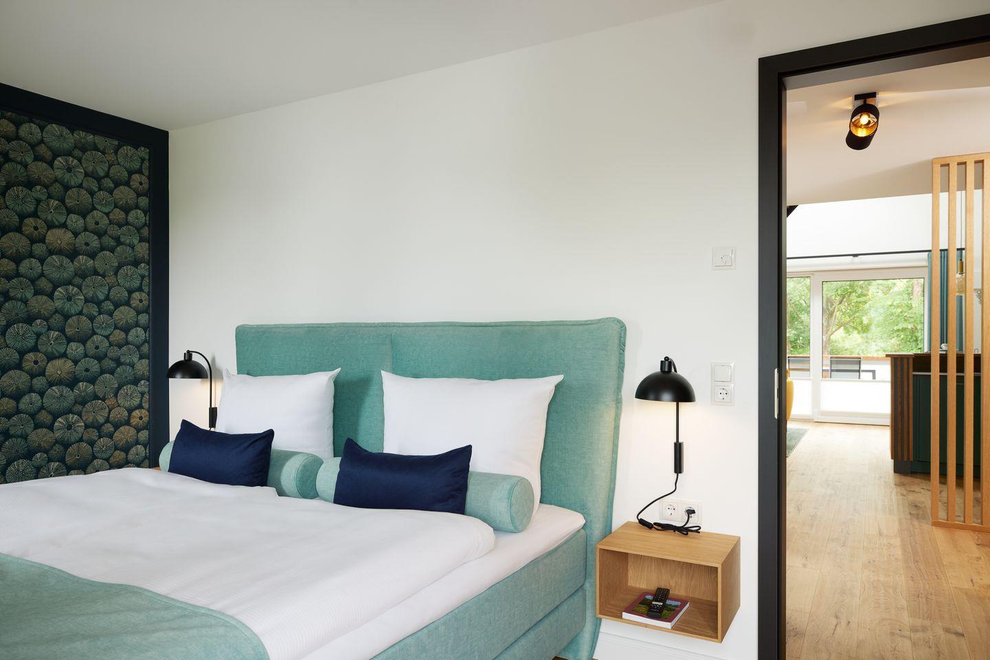 Zwei Schlafzimmer mit bequemen Boxspringbetten bieten Platz für drei Gäste. Das moderne Badezimmer verfügt über eine begehbare Dusche. Es besteht eine weitere Schlafmöglichkeit für bis zu 2 Personen.
