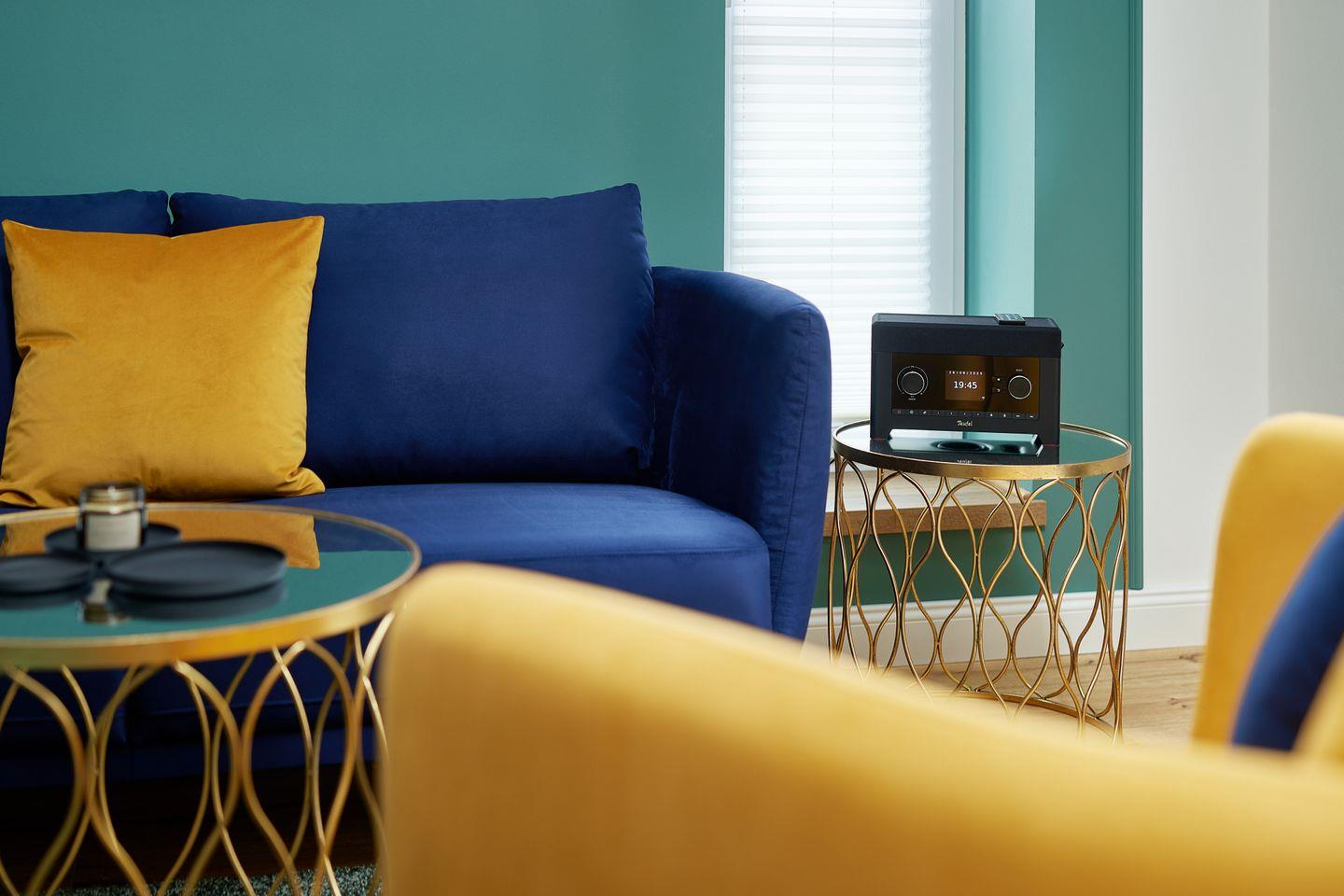 Der Wohn- und Essbereich mit integrierter Küche und Design-Polstermöbeln lädt zum gemütlichen Zusammensein.
