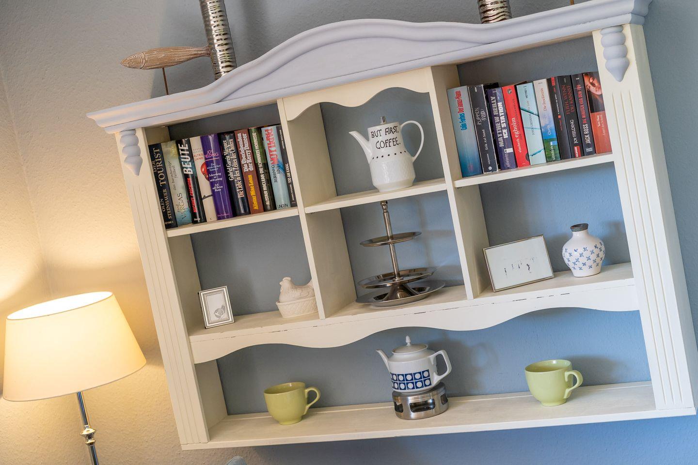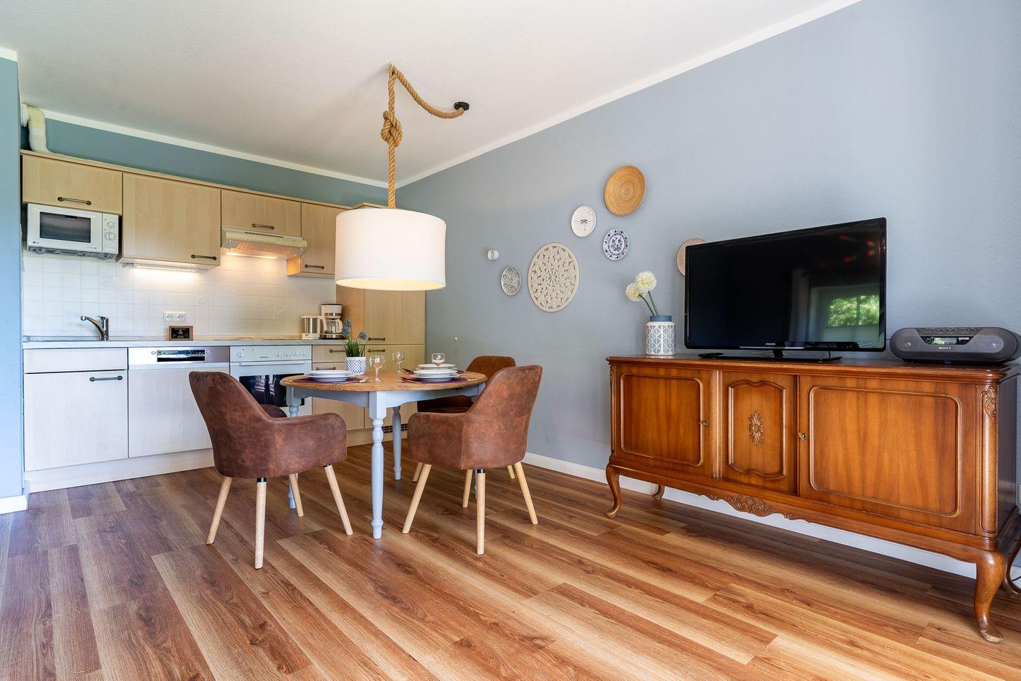 Ebenfalls im Erdgeschoss gelegen, bietet die ca. 52 m² große Ferienwohnung Robbe ein gemütliches Zuhause für zwei Personen. Sie verfügt über einen offenen Wohn- und Essbereich mit zwei Sofas, Sat-TV, Radio, CD-Player und WLAN. Der Essplatz mit rundem Tisch ist ideal für Mahlzeiten oder gesellige Abende.