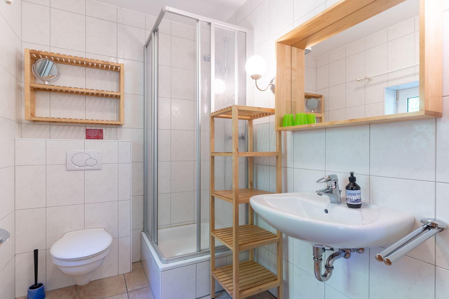 Das helle Tageslichtbad bietet eine Dusche mit hohem Einstieg, WC, Föhn und Ablagemöglichkeiten. Die teilweise überdachte Terrasse zur Südseite ist mit bequemen Gartenmöbeln ausgestattet.