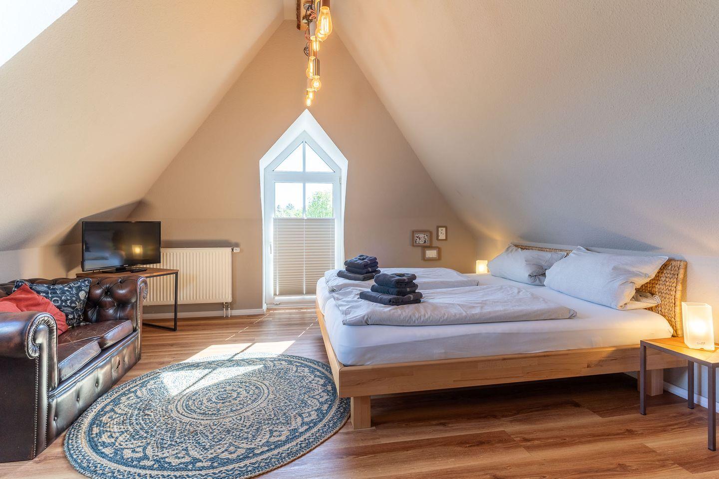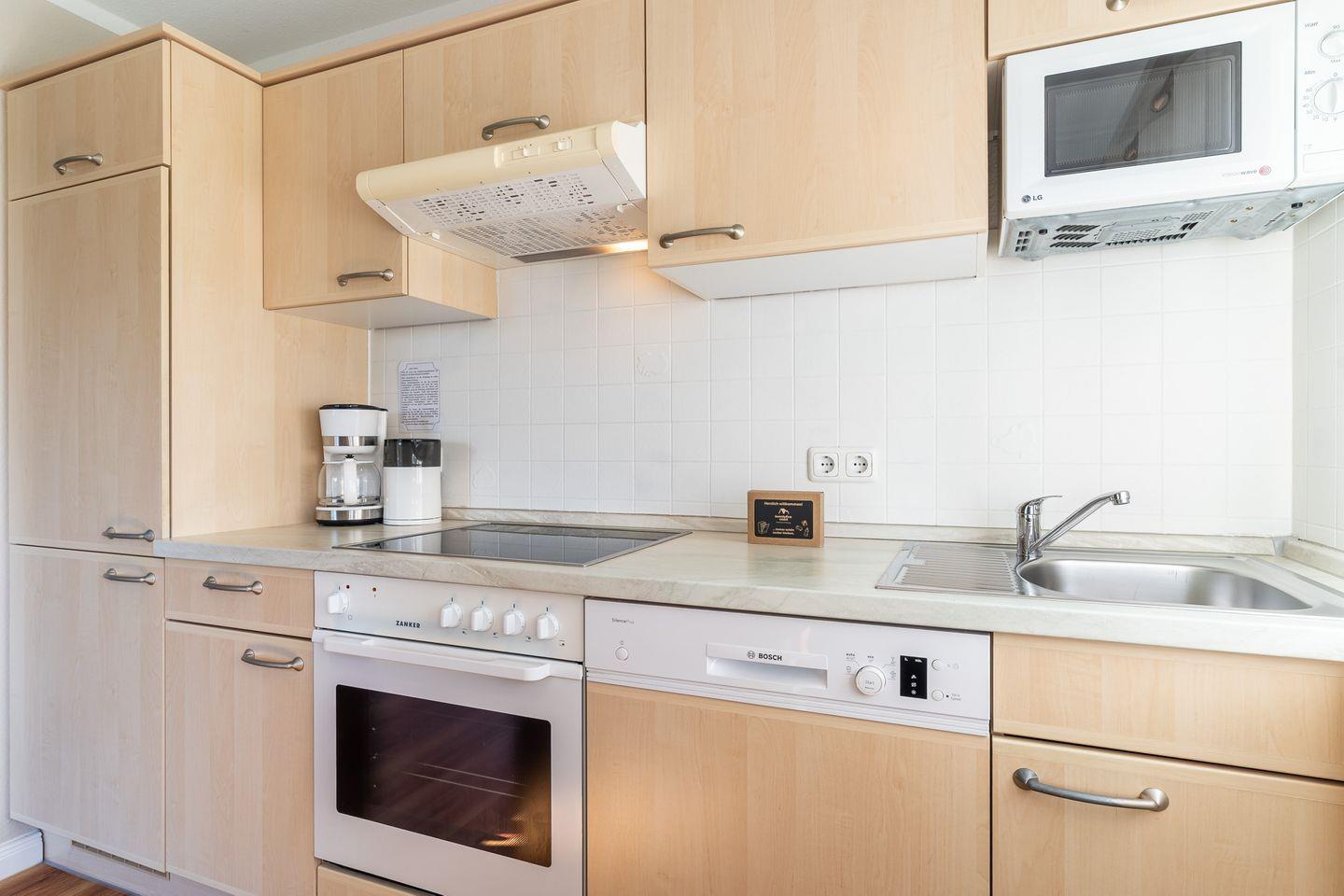 Die offene Küche ist voll ausgestattet mit Cerankochfeld, Backofen, Spülmaschine, Mikrowelle, Kühlschrank, Toaster, Wasserkocher und Kaffeemaschine. Zwei separate Schlafzimmer mit Doppelbetten (jeweils 135x200 cm) verteilen sich auf zwei Ebenen – eines davon im Staffelgeschoss über eine Treppe erreichbar.