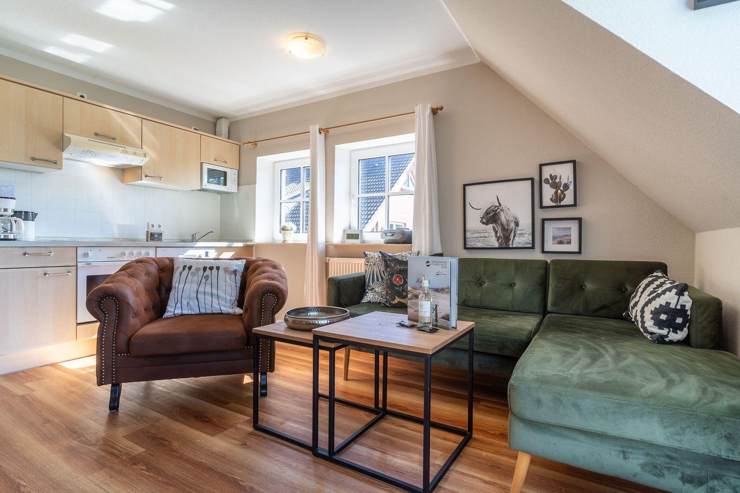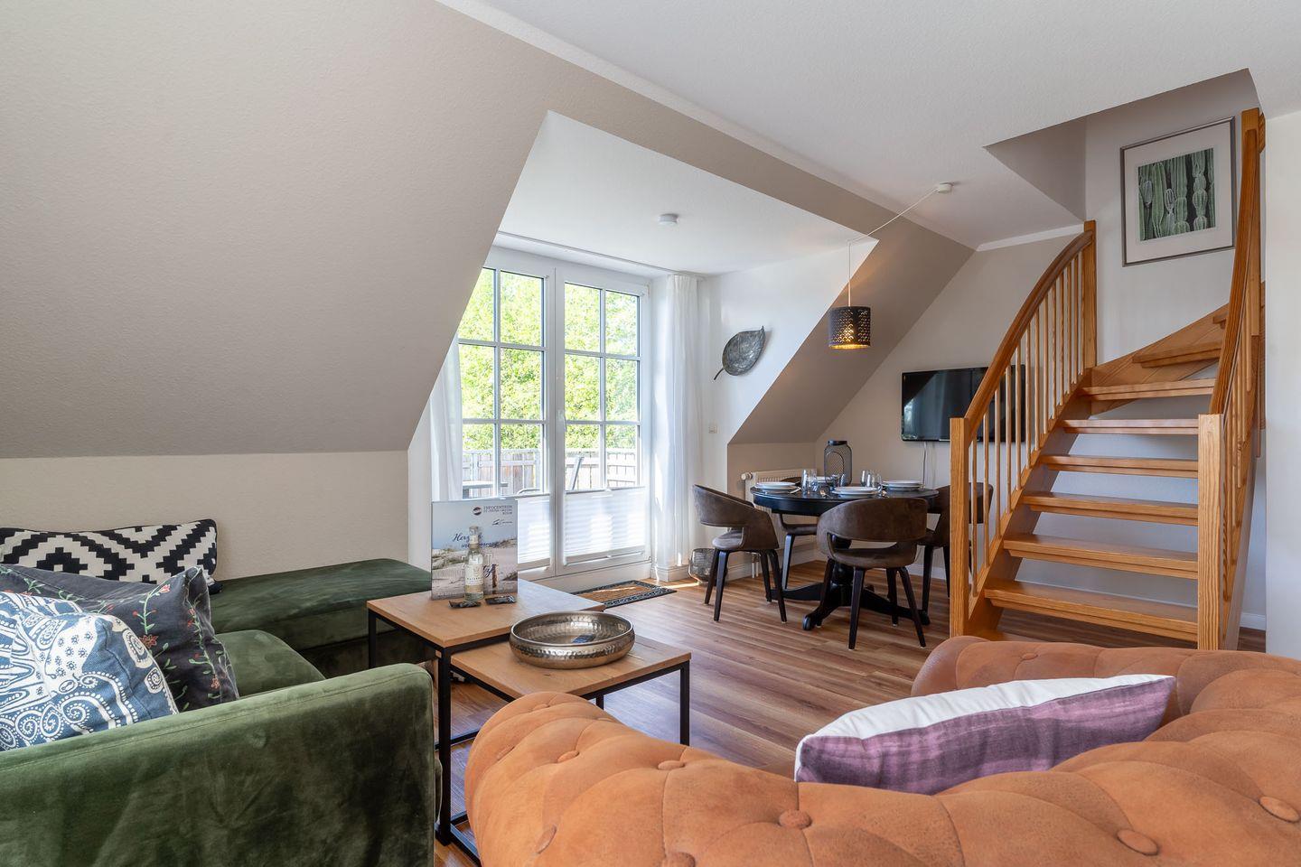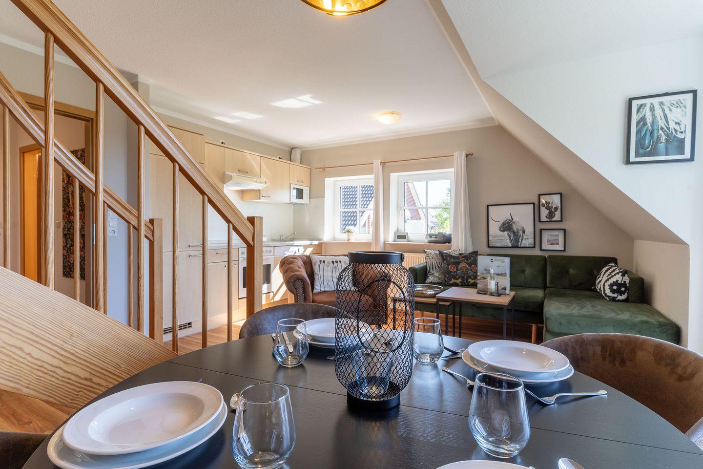 Die Ferienwohnung Möwe im 1. Obergeschoss (mit Staffelgeschoss) bietet auf 68 m² Platz für bis zu 4 Personen. Der gemütliche Wohnbereich mit Eckcouch, Sessel, Flachbild-TV, Radio und WLAN geht in einen Essplatz für 4 Personen über.