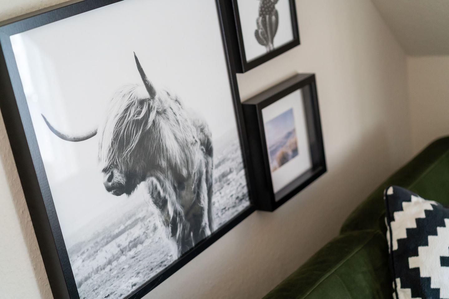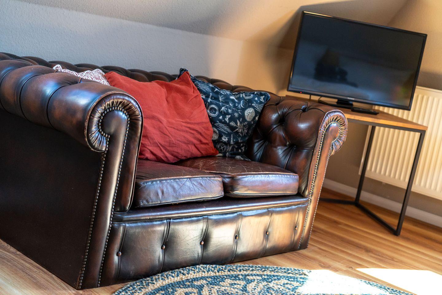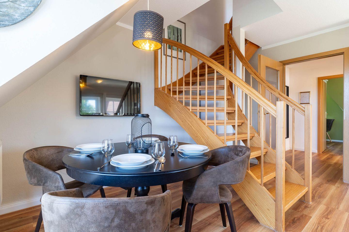 Die Ferienwohnung Möwe im 1. Obergeschoss (mit Staffelgeschoss) bietet auf 68 m² Platz für bis zu 4 Personen. Der gemütliche Wohnbereich mit Eckcouch, Sessel, Flachbild-TV, Radio und WLAN geht in einen Essplatz für 4 Personen über.