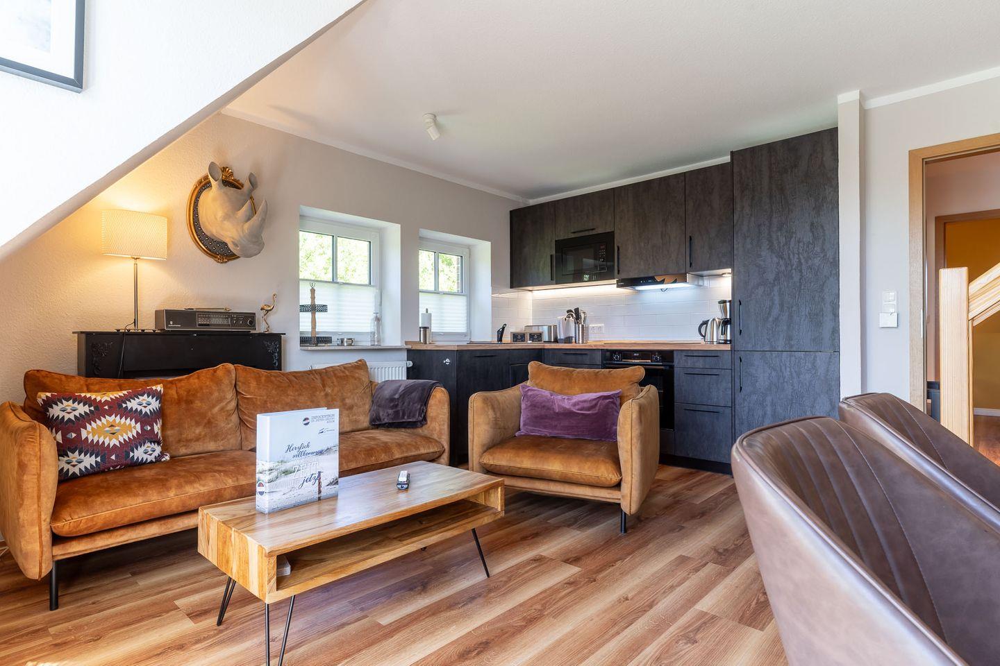 Modern eingerichtete Wohnung mit ca. 68?m² über zwei Etagen für 2–4 Personen. Zwei Schlafzimmer, hochwertige Küche, Balkon zur Südseite, WLAN und Parkplatz. Ruhige Lage im Ortsteil Dorf, nur wenige Minuten zum Strand.