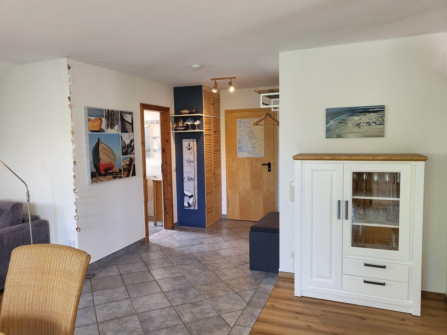 Das Wohnzimmer überzeugt durch eine einladende moderne Sofaecke, Essbereich sowie einem Fernseher, DVD-Player, CD-Player und Radio, sodass Sie auch an regnerischen Tagen bestens unterhalten werden.