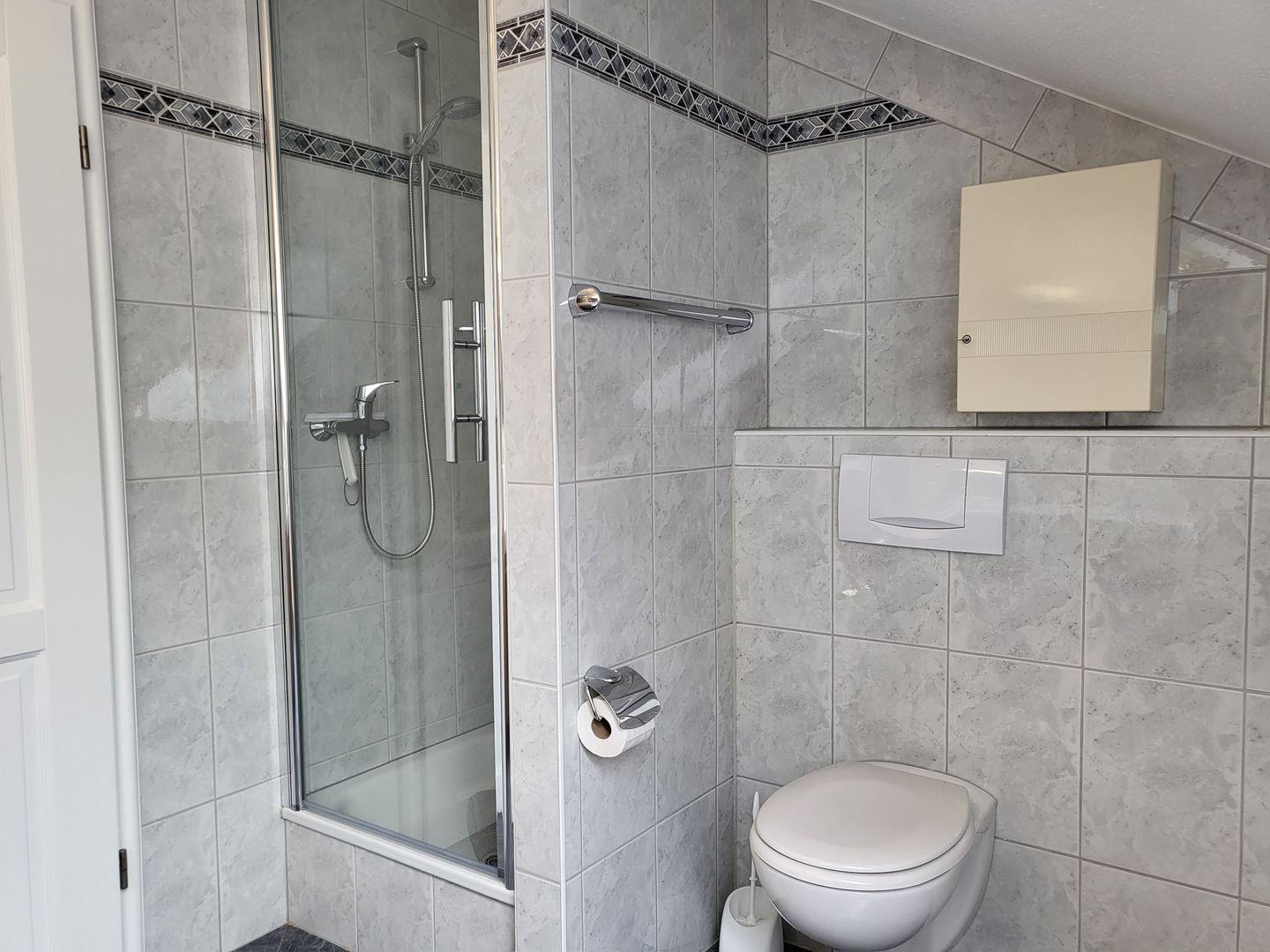Das Badezimmer ist modern eingerichtet und bietet eine Dusche, WC und Waschtisch. Darüber hinaus ist ein Fenster vorhanden, das für ausreichend Tageslicht sorgt. Die gesamte Ferienwohnung ist allergikerfreundlich.