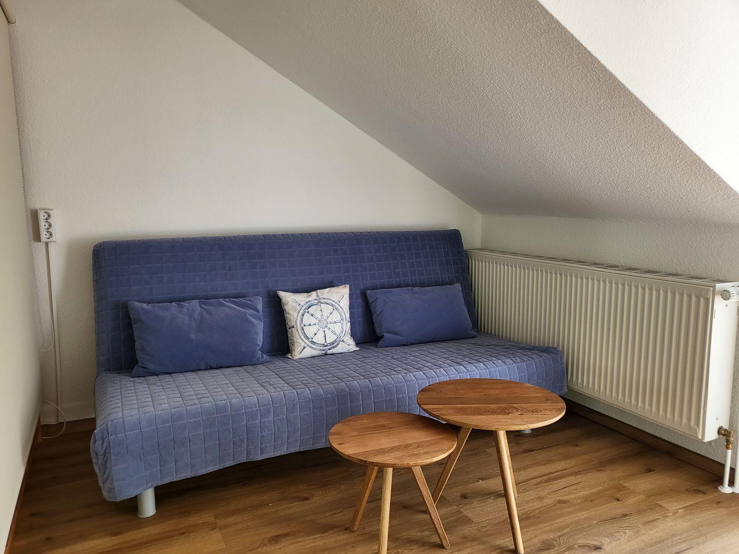 Es steht ein Schlafzimmer mit hochwertigem Vinylboden sowie einem gemütlichen Bett (180x 200) und einem Kleiderschrank zur Verfügung. Für eine zusätzliche Schlafmöglichkeit sorgt eine Schlafcouch (140x 200) im Wohnzimmer durch eine Trennwand integriert.