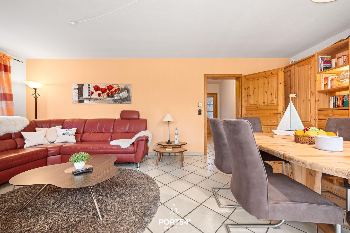 Die großzügige Wohnlandschaft lädt zum Entspannen und Verweilen ein. Der große Esstisch ermöglicht gemeinsame Mahlzeiten oder Spieleabende. Zur Unterhaltung stehen Ihnen ein Fernseher mit DVD-Spieler sowie viele Bücher zur Verfügung. Kostenloses WLAN sorgt dafür, dass Sie auch digital bestens verbunden bleiben.