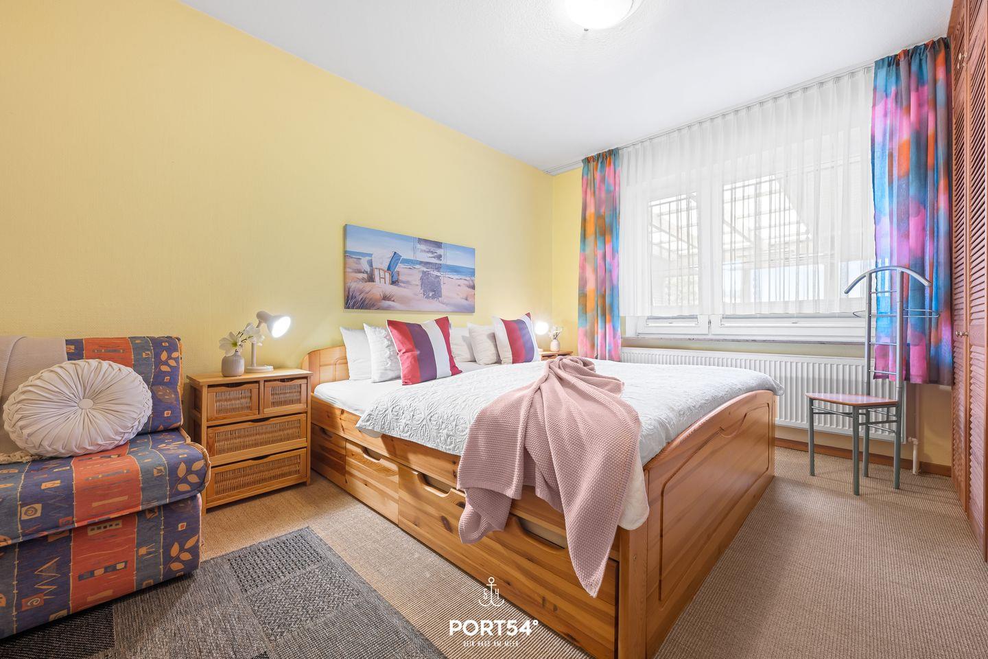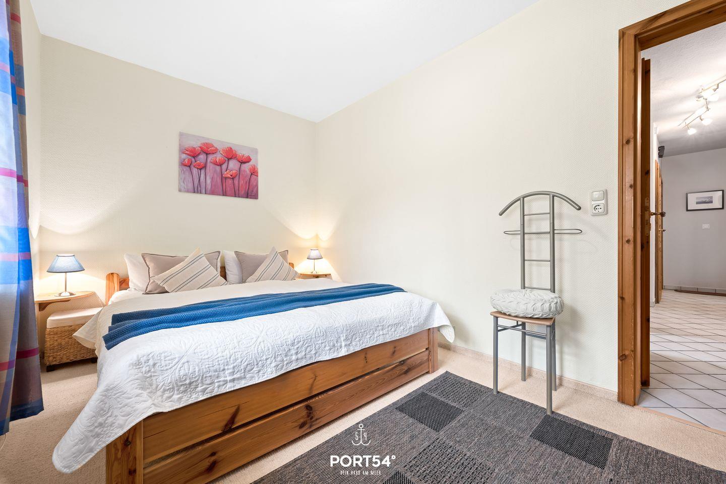 In der Wohnung erwarten Sie zwei komfortable Schlafzimmer mit einem gemütlichen Teppichboden und Platz für eine angenehme Nachtruhe. Das moderne Badezimmer ist mit einer Dusche und einer separaten Badewanne ausgestattet – ideal für eine wohlverdiente Auszeit nach einem Tag am Strand oder in der Natur.