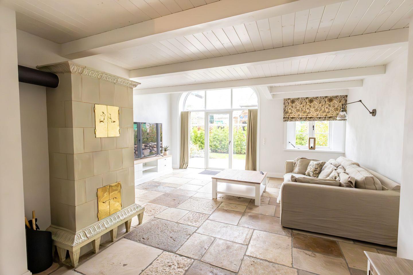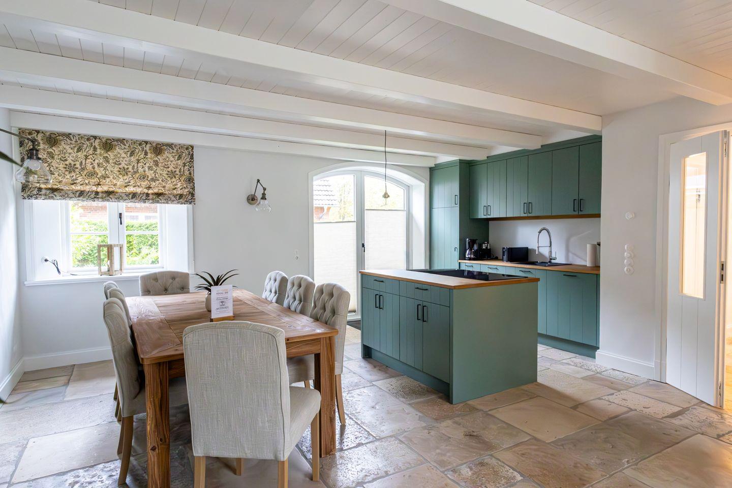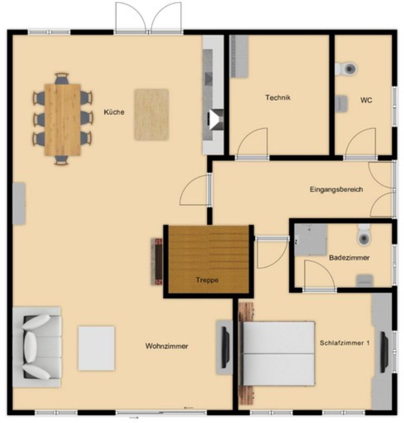 Der offen gestaltete Wohn- und Küchenbereich lädt mit einer stilvollen Kombination aus Helligkeit und Funktionalität zum Verweilen und geselligen Beisammensein ein. Die voll ausgestattete Küche verfügt neben einem Herd, Kühlschrank, Geschirrspüler und Wasserkocher auch über eine Kaffeemaschine, Toaster sowie sämtliche benötigte Küchenutensilien und Geschirr. Ein großzügiger Esstisch sorgt für gemeinsame Mahlzeiten, während der moderne Kamin-Ofen im Wohnbereich eine behagliche Atmosphäre schafft, hier steht Ihnen ein Flachbild-TV zur Verfügung. Für ein angenehmes Raumklima im gesamten Haus sorgt eine durchgehende Fußbodenheizung.
