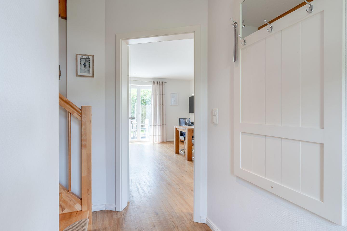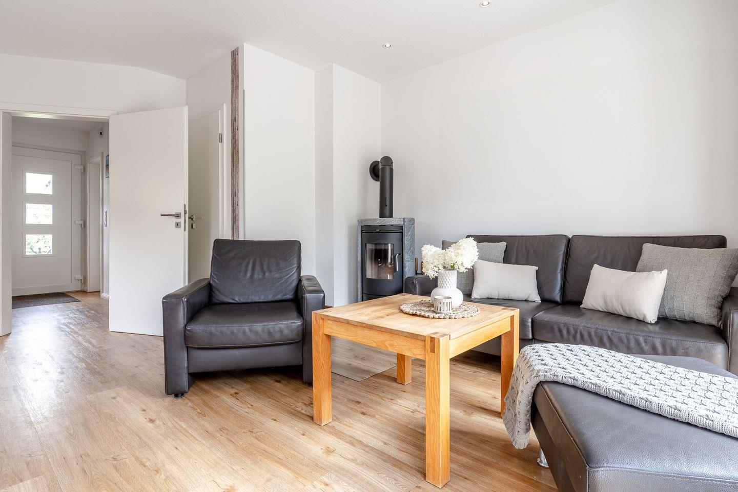 Im Erdgeschoss erwartet Sie ein Wohn- und Essbereich mit einem einladenden Specksteinofen und einer modernen offenen Küche. Zusätzlich verfügt das Erdgeschoss über ein Gästebad mit einer ebenerdigen Dusche. Von hier aus können Sie direkt auf die sonnige Süd-Terrasse treten, die mit edlen Gartenmöbeln aus Teak-Holz ausgestattet ist – der perfekte Ort, um die Sonne zu genießen.