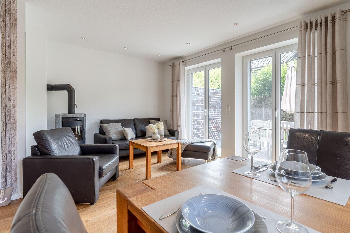 Modernes Doppelhaus Sonnenstern in St. Peter-Ording mit Terrasse, Garten und Kamin – ideal für entspannte Ferien.