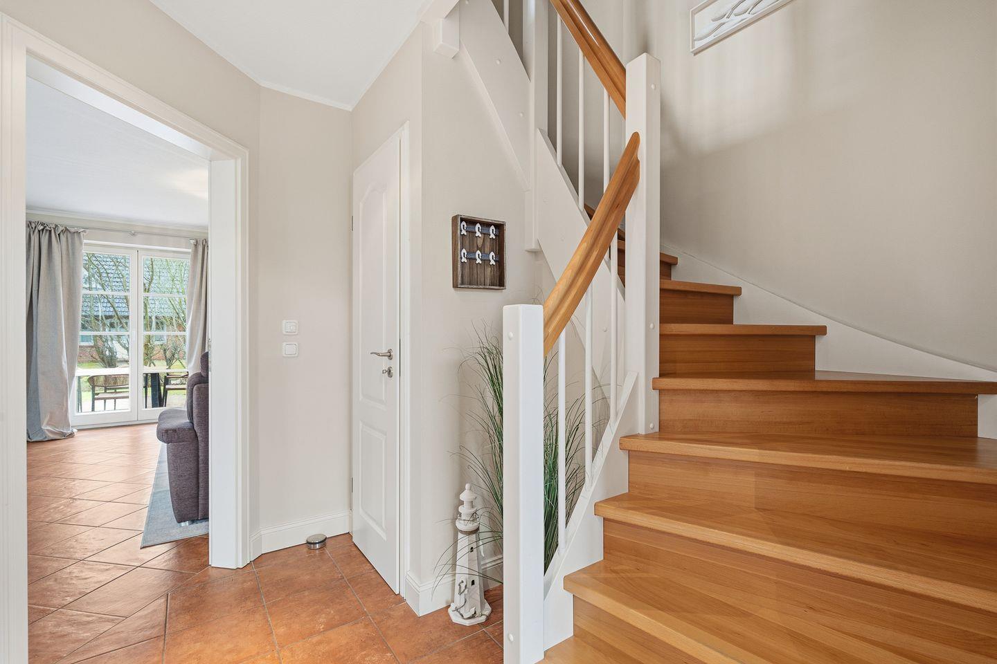 Die möblierte Terrasse sowie der Strandkorb laden zum Entspannen ein, während der umlaufende Garten mit seiner heimischen Bepflanzung Ruhe und Erholung bietet. Fahrräder finden Platz entweder am Haus oder im Gartenhaus. Ihr Auto parkt sicher auf dem zugeordneten Stellplatz auf dem Grundstück.