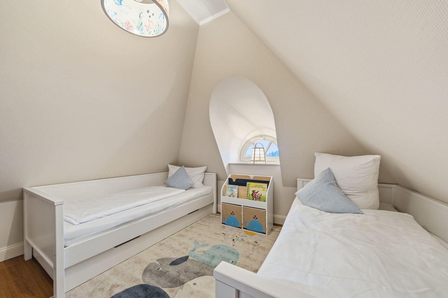 Im Dachgeschoss finden Sie ein weiteres Schlafzimmer mit zwei Einzelbetten – ein Kinderparadies mit Spielsachen und Kindermöbeln.