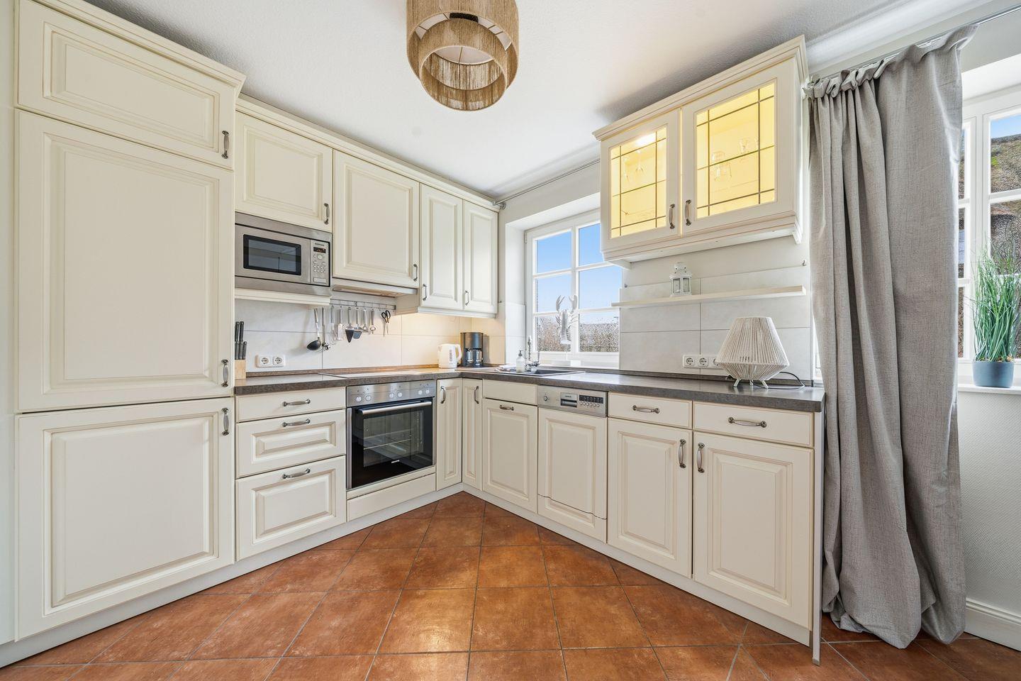 Die offene Küche ist komplett ausgestattet und lässt keine Wünsche offen mit modernen Geräten wie einem 4-Felder-Herd, einem Backofen, einer Mikrowelle sowie einem Geschirrspüler.