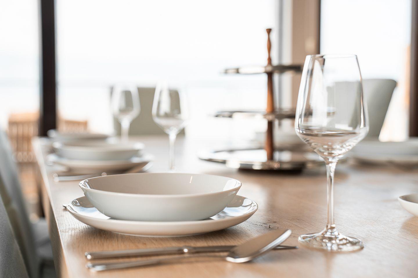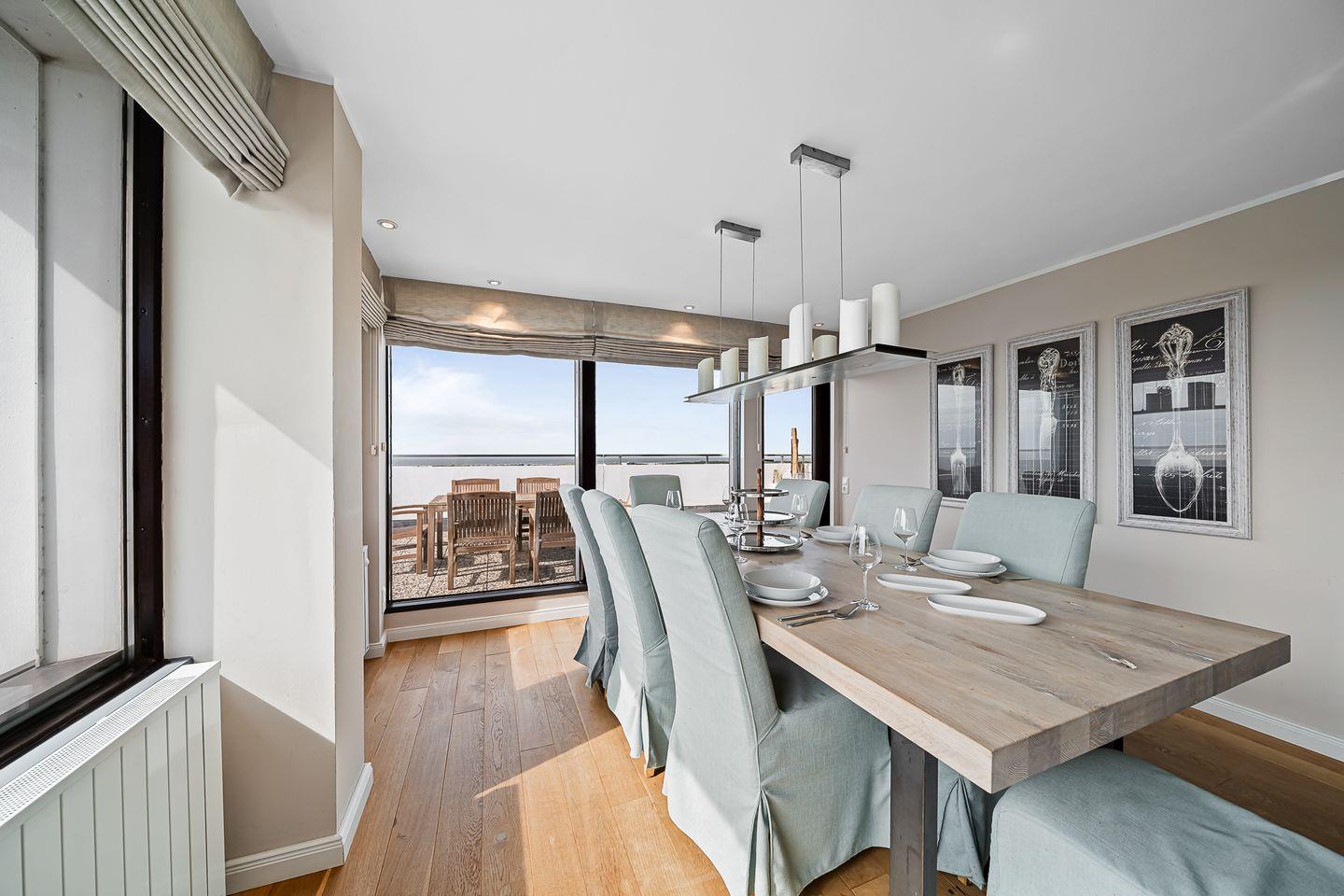 Das geräumige Wohnzimmer des Penthouse verfügt über einen stilvollen Essbereich auf einem erhöhten Podest. Von hier aus erstreckt sich ein malerischer Blick auf den Strand und die endlose Nordsee – ein Ort der Entspannung und Erholung.