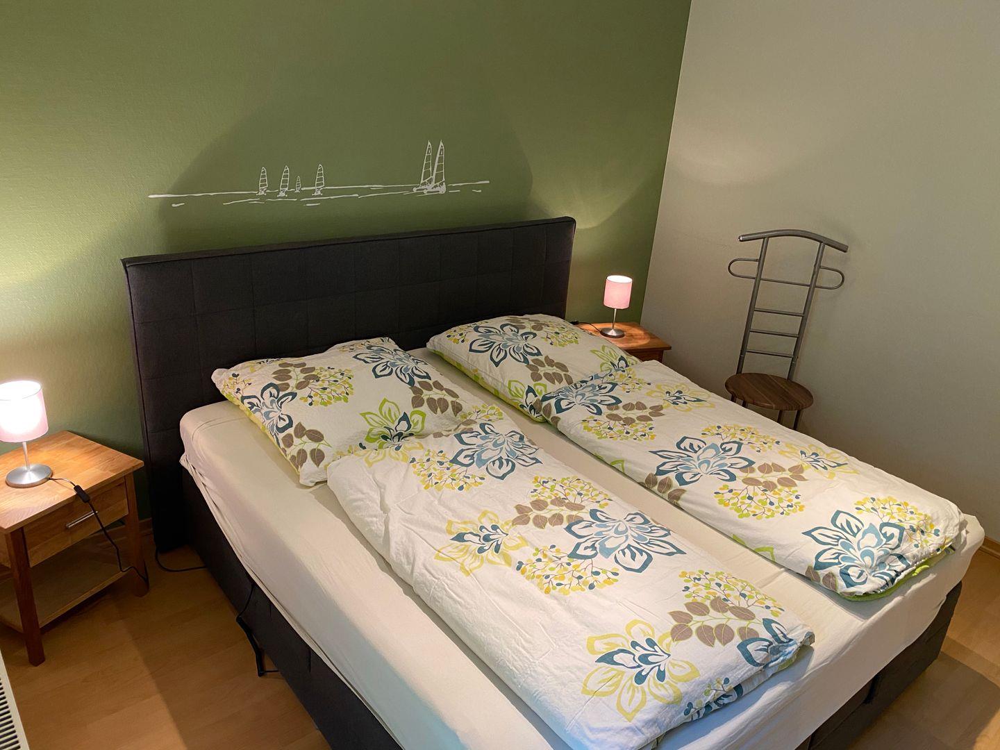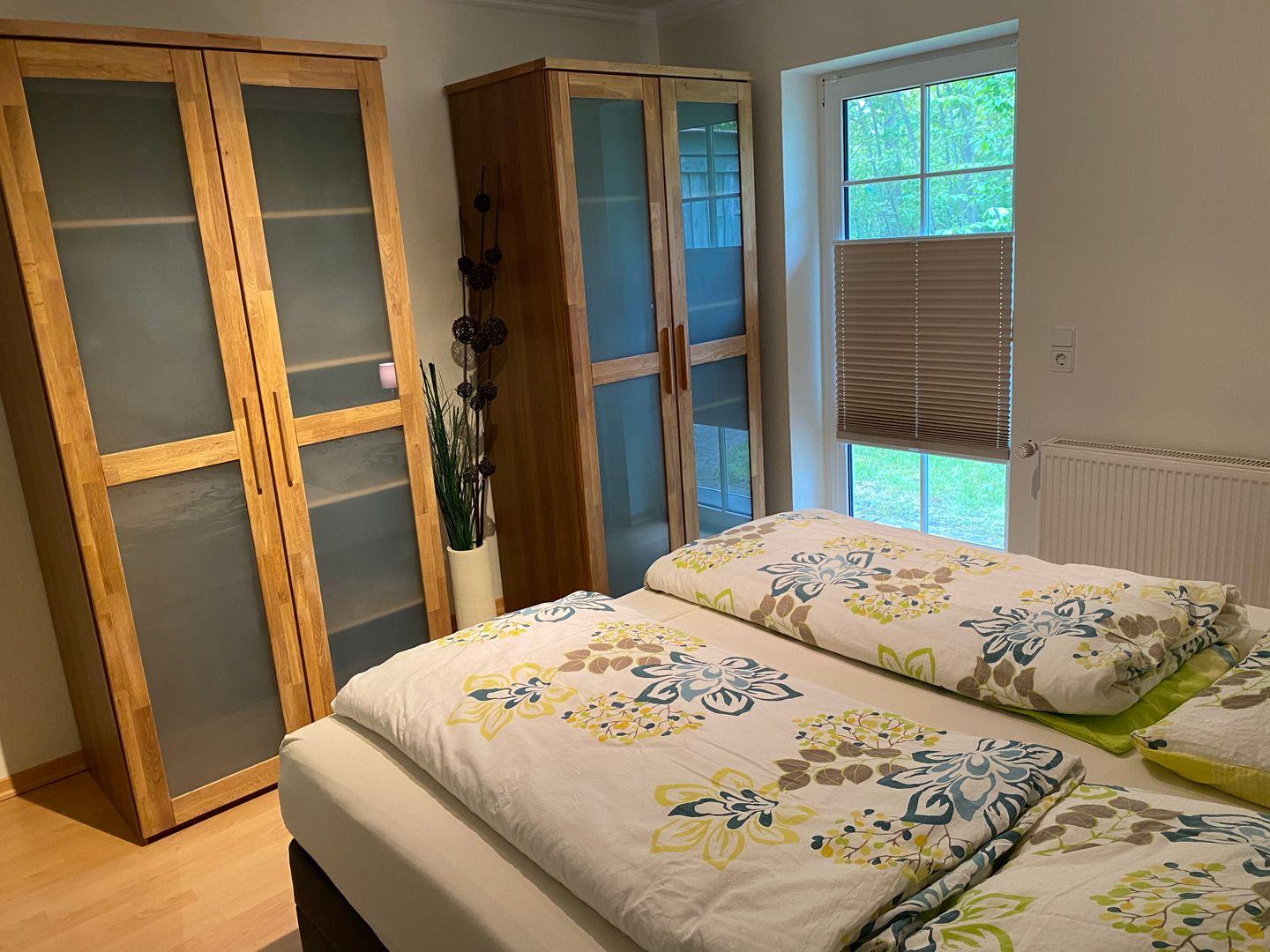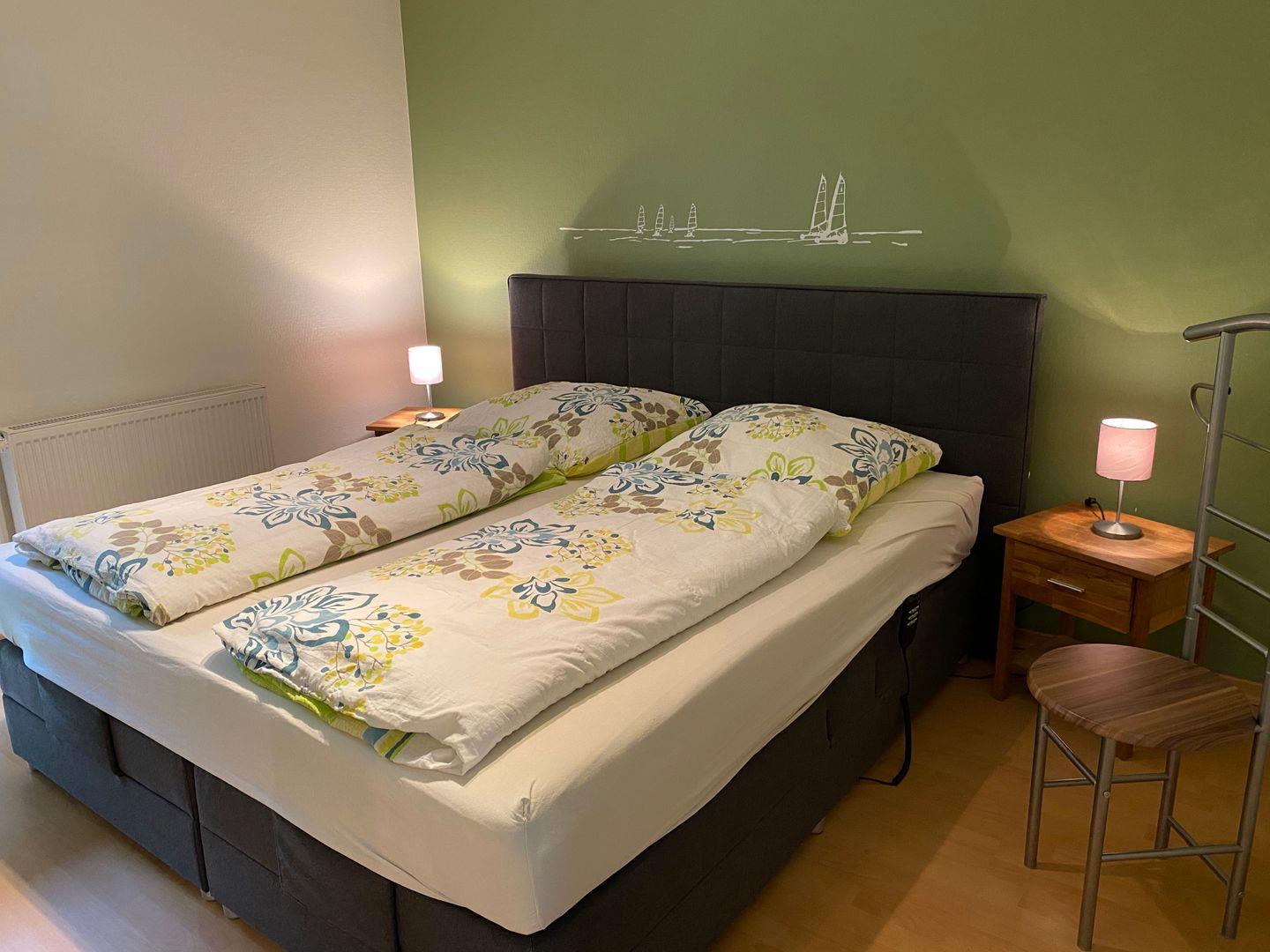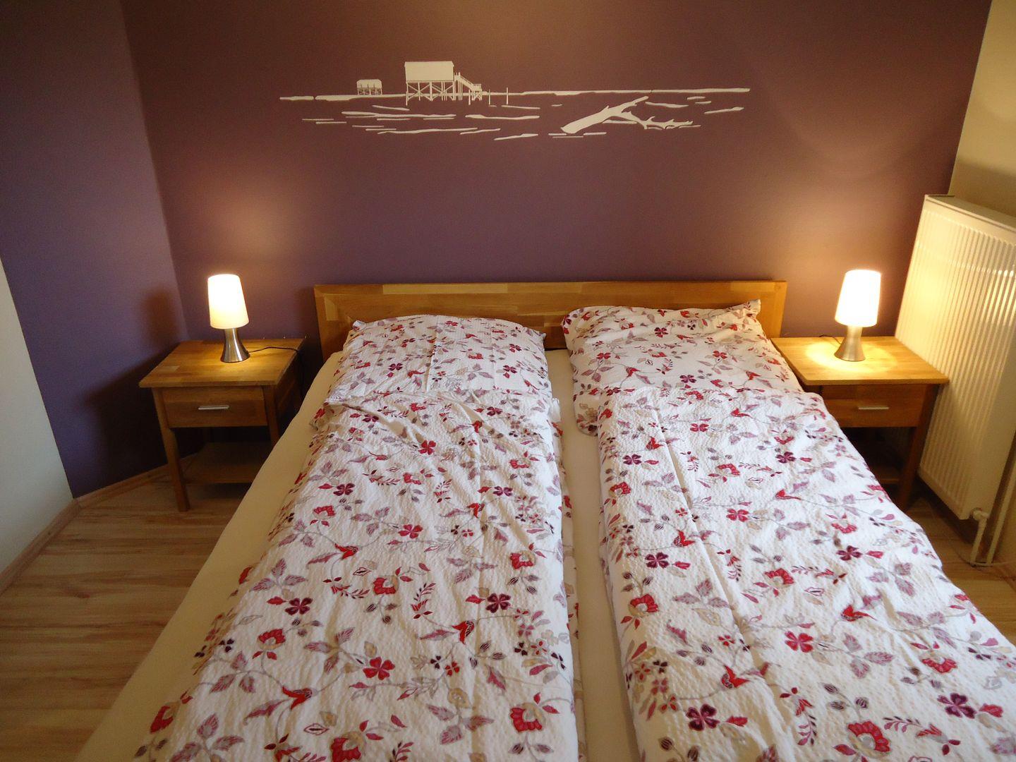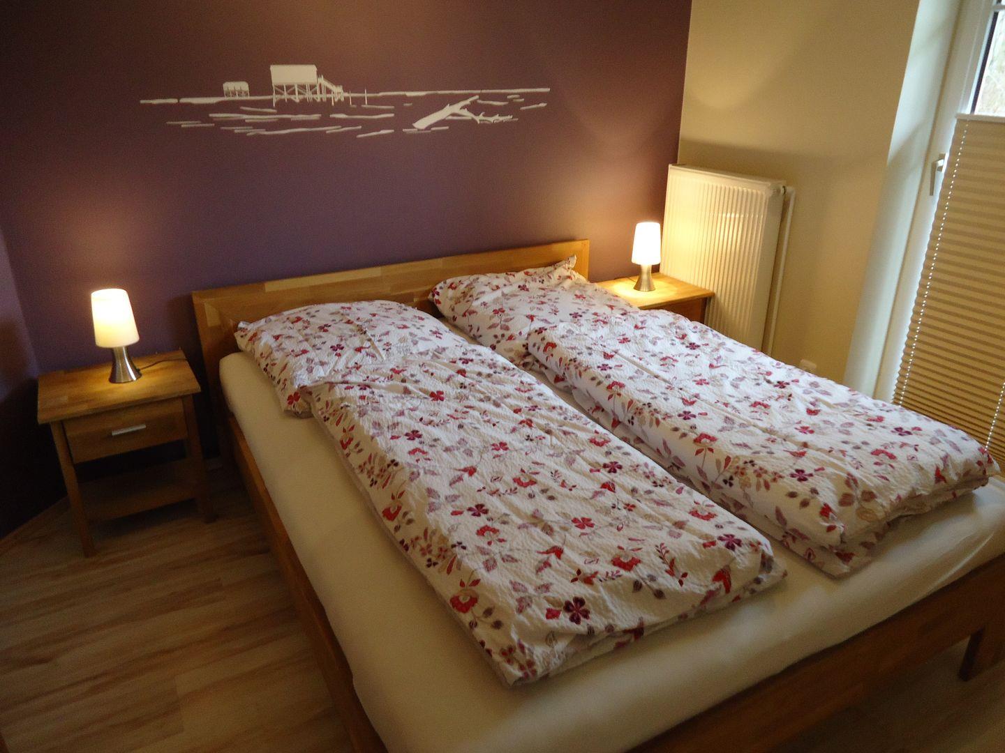 ein Schlafzimmer mit Doppelbett (180 x 200 cm), ein Schlafzimmer mit Doppelbett (160 x 200 cm), ein Schlafzimmer mit Doppelbett (140 x 200 cm).