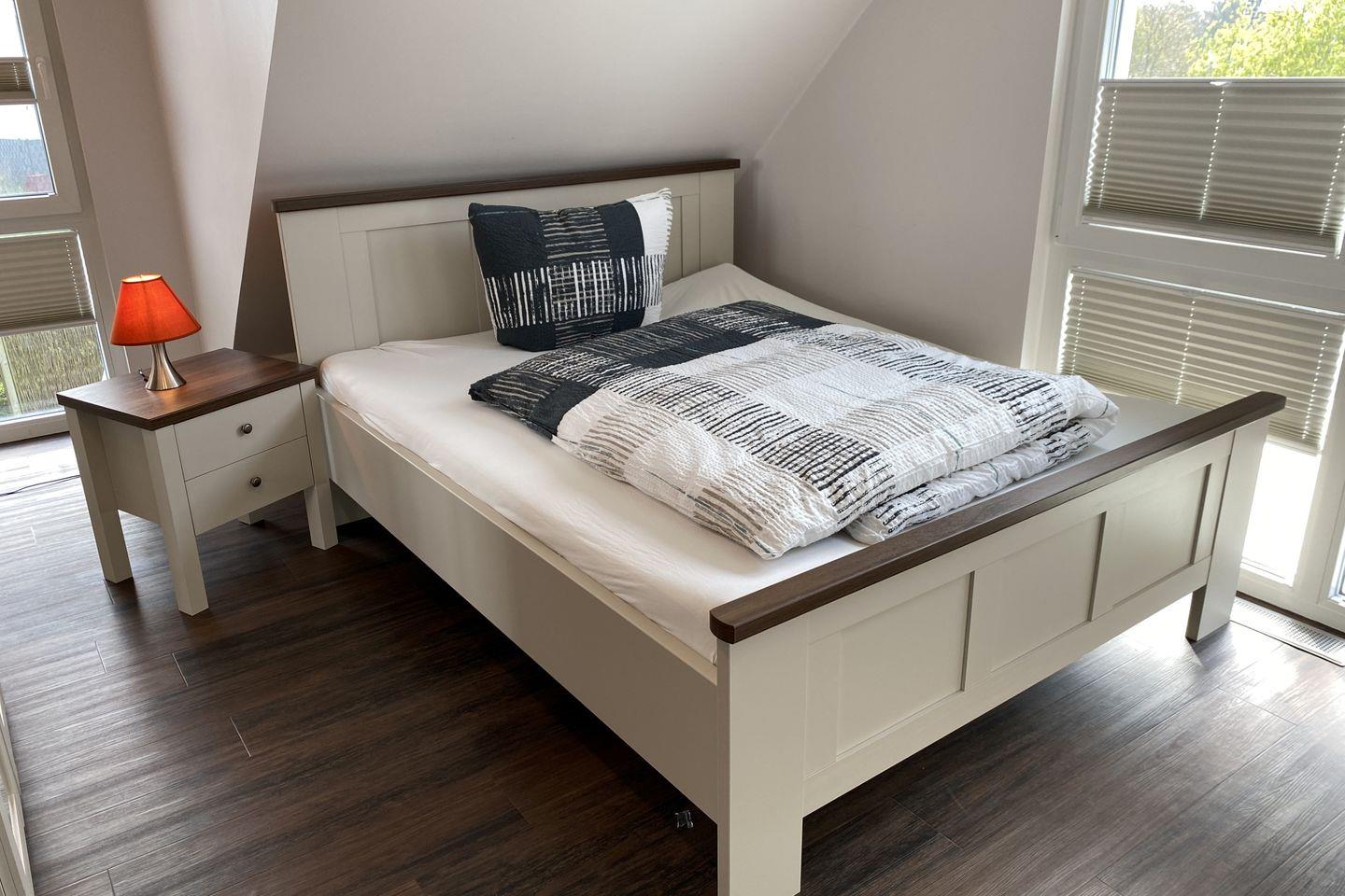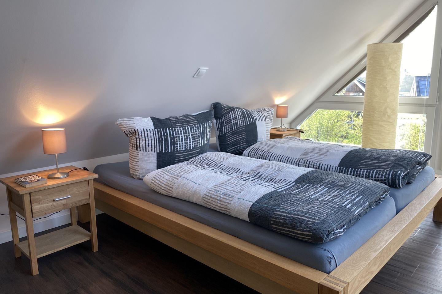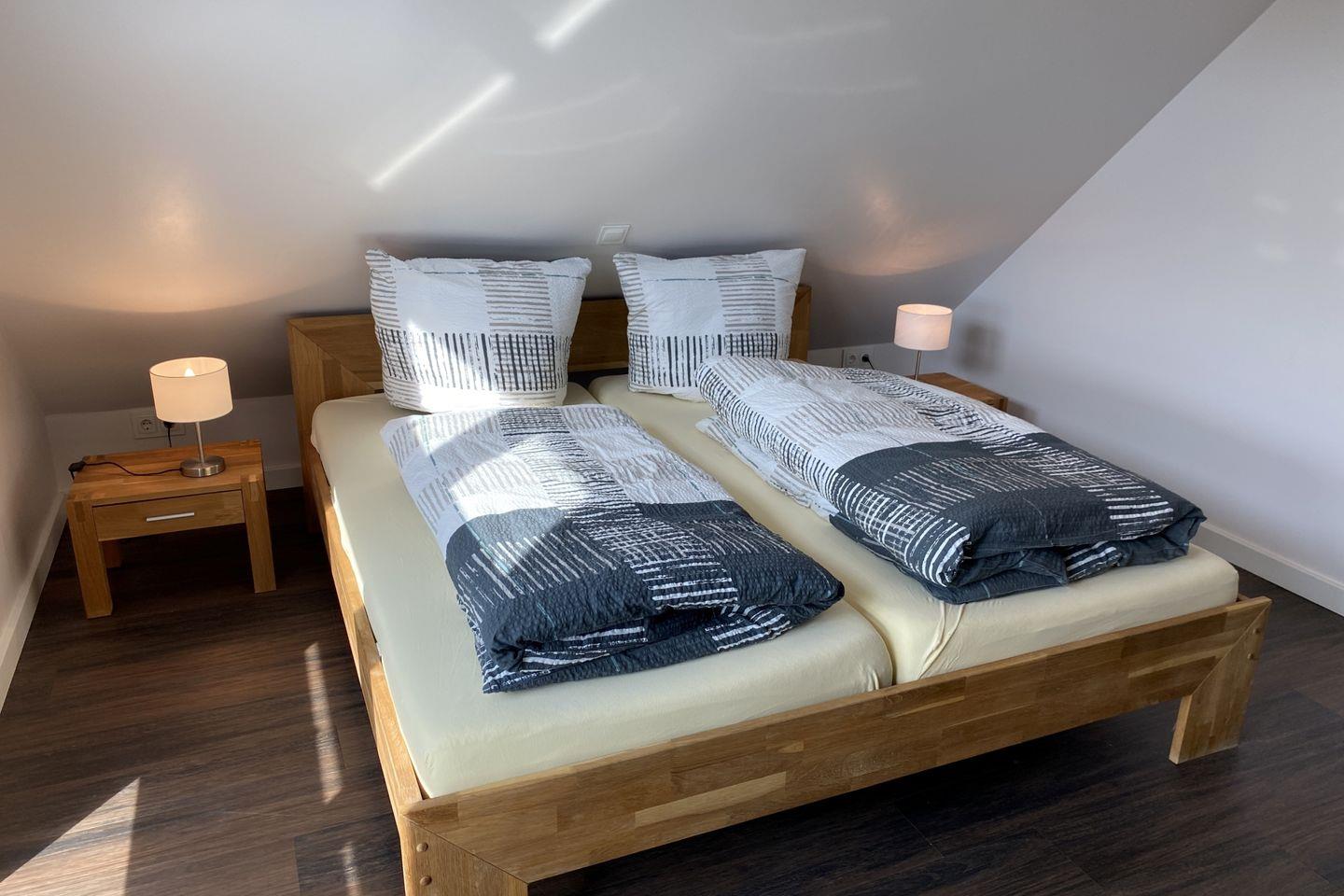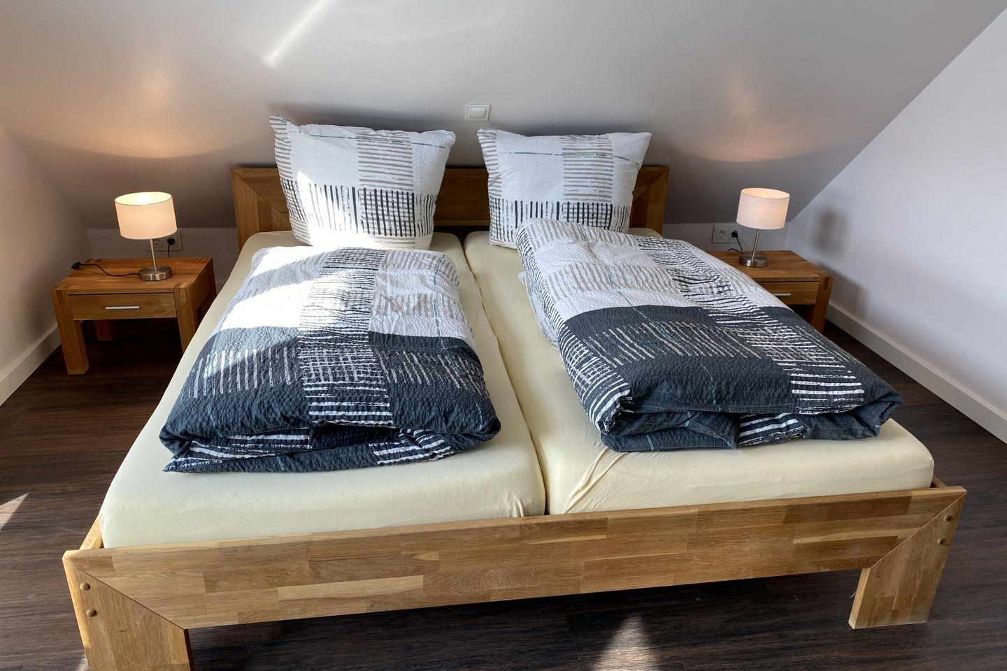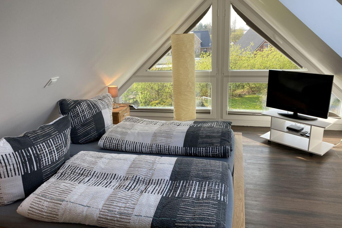 Dachgeschoss: ein Schlafzimmer mit Doppelbett (180x200cm- Einzelmatratzen) und TV