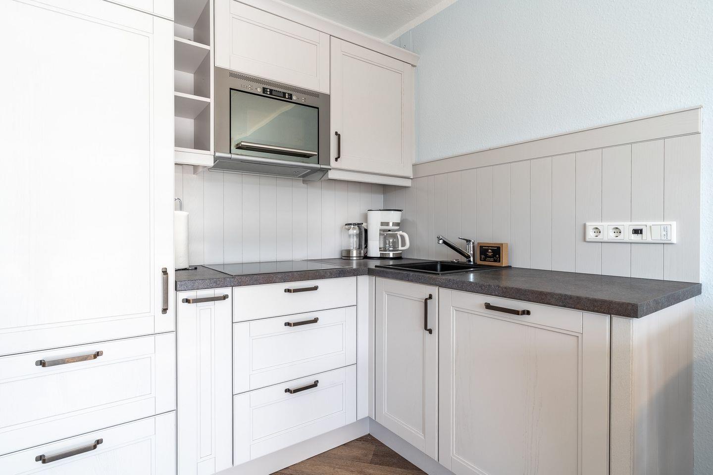 Die offene Küche ist funktional und hochwertig eingerichtet und verbindet sich nahtlos mit dem Wohnzimmer, sodass auch gemeinsames Kochen zu einem geselligen Erlebnis wird. Zur Ausstattung gehören ein Cerankochfeld, ein Backofen mit Elektroanschluss, Kühlschrank mit integriertem Gefrierfach, Spülmaschine, Mikrowelle, Wasserkocher, Toaster und Kaffeemaschine. Selbstverständlich sind Geschirr, Besteck, Küchenutensilien und Geschirrhandtücher vorhanden. Für gesellige Mahlzeiten steht Ihnen ein separater Essbereich mit Esstisch bereit.