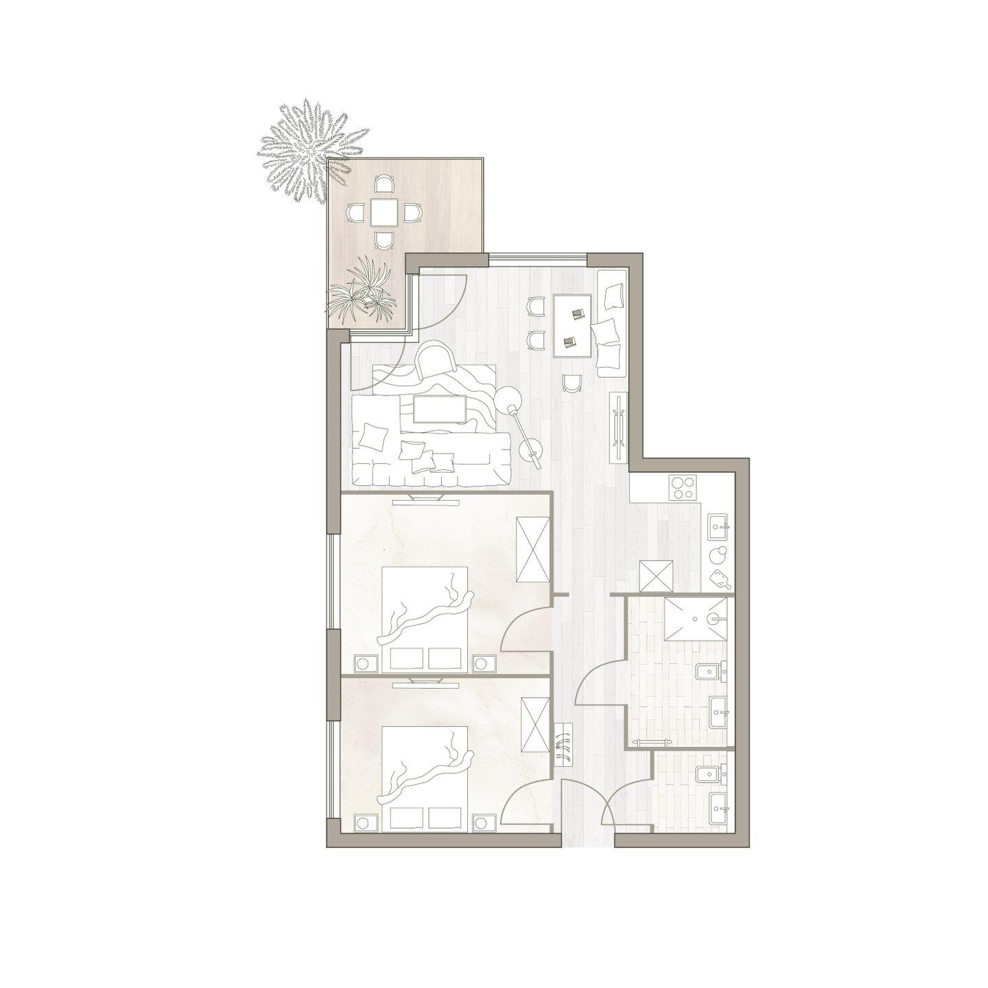 Ein möblierter Balkon in Nord-Ost/Nord-West-Lage bietet Raum für entspannte Momente. Die zwei Schlafzimmer sind mit je einem komfortablen Doppelbett, Schrank und Smart TV ausgestattet. Zudem verfügt das Apartment über ein modernes, mit anthrazitfarbenen Natursteinfliesen gestaltetes Badezimmer und ein separates WC.