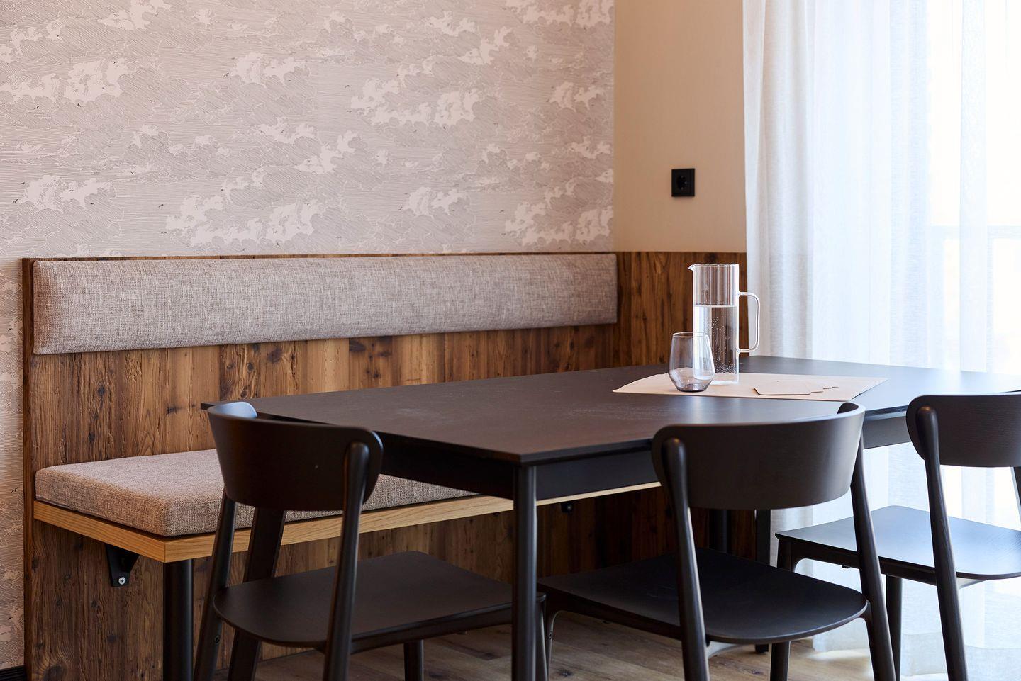Der offen gestaltete Wohn-Essbereich mit integrierter Küche wird von Nord-Osten mit Tageslicht durchflutet. Ein großer Esstisch mit Sitzbank und Stühlen ist ein Ort zum Zusammensein ebenso wie die gemütliche Sofaecke in hellem Naturton.