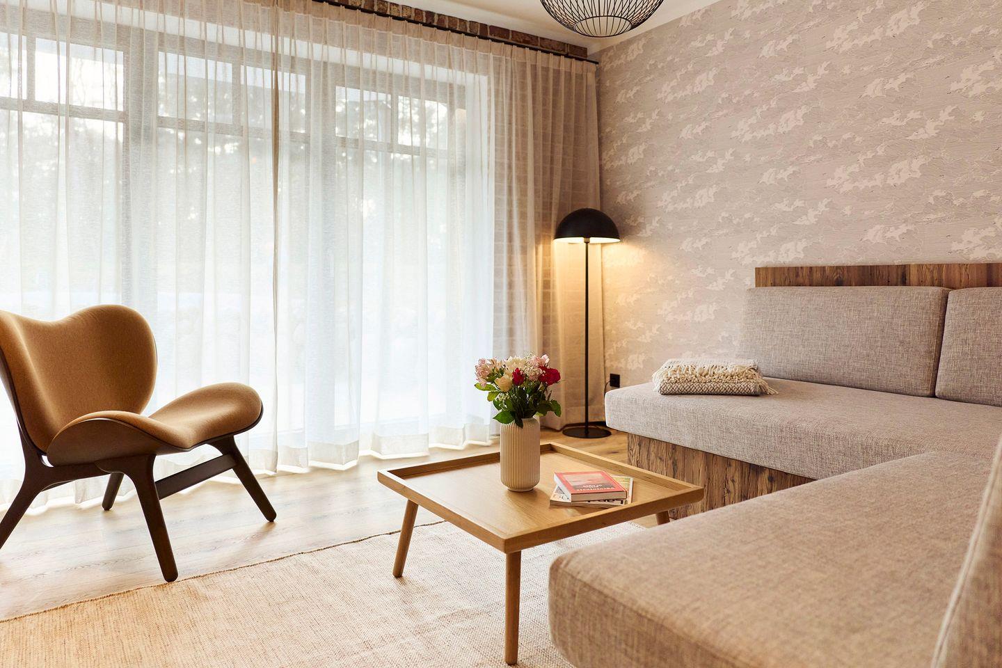 Der offen gestaltete Wohn-Essbereich mit integrierter Küche wird von Süd-Westen mit Tageslicht durchflutet. Ein kleiner Esstisch ist ein Ort zum Zusammensein ebenso wie die gemütliche Sofaecke in hellem Naturton. Die möblierte Terrasse mit Süd-West-Ausrichtung bietet Sonne bis in den Abend hinein. Das separate Schlafzimmer ist mit einem komfortablen Doppelbett, Schrank und Smart TV ausgestattet. Ein Plus: der direkte Zugang zur Terrasse! Zudem verfügt das Apartment über ein modernes, mit Natursteinfliesen gestaltetes Badezimmer.