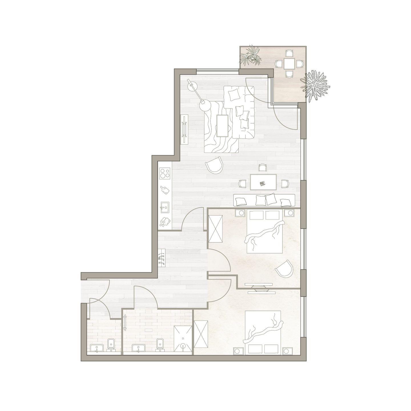 Auf dem möblierten Balkon lässt sich der Urlaubstag mit einem Frühstück in der Sonne beginnen. Die zwei Schlafzimmer sind mit je einem komfortablen Doppelbett, Schrank und Smart TV ausgestattet. Zudem verfügt das Apartment über ein modernes, mit anthrazitfarbenen Natursteinfliesen gestaltetes Badezimmer und ein separates WC.