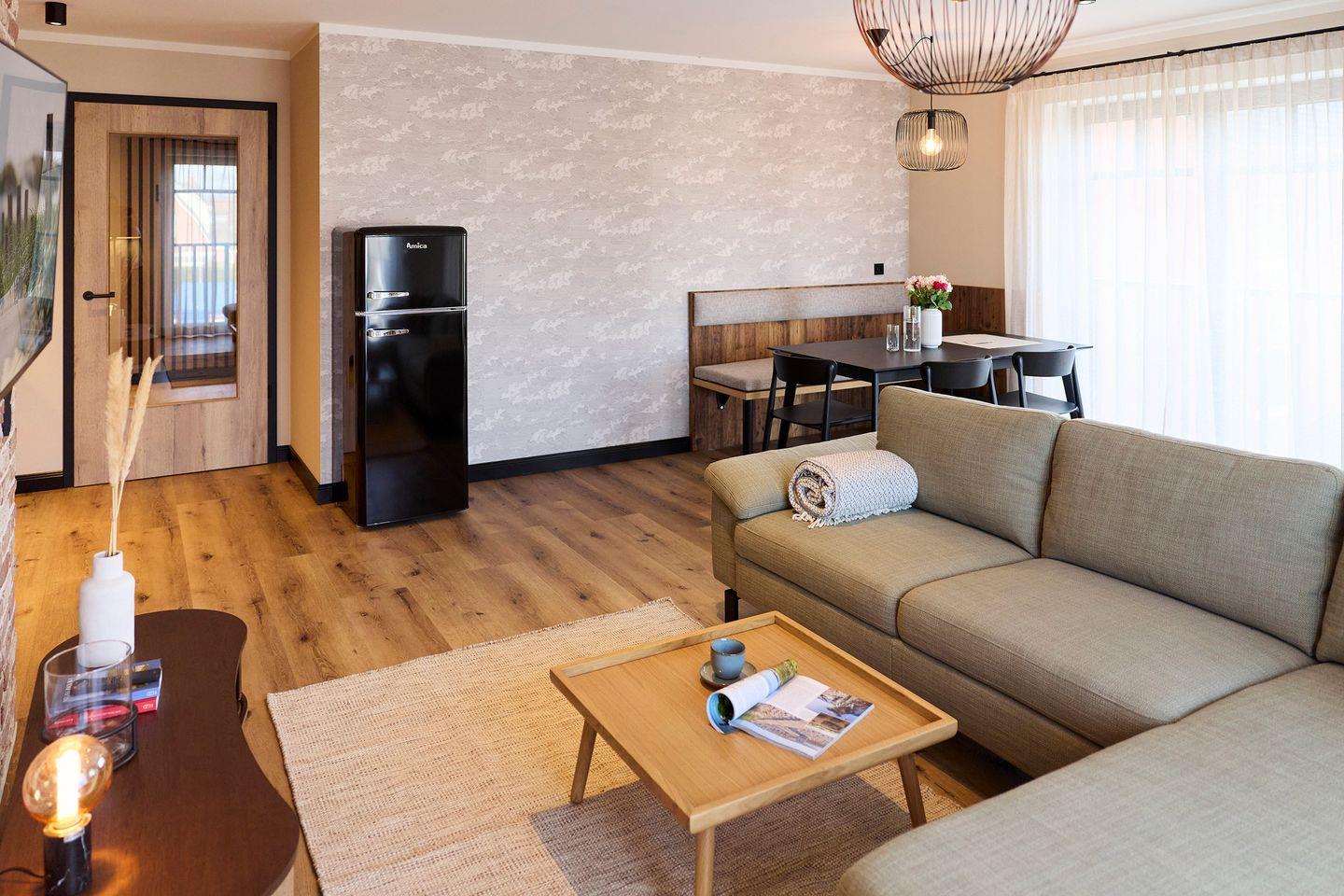 Auf rund 85 Quadratmetern finden vier Gäste Ihr kleines Urlaubsrefugium mit nordischem Wohlfühldesign. Genießen Sie das entspannte Ambiente im lässigen Industrial Style, das gleichzeitig jede Menge Cozyness versprüht.