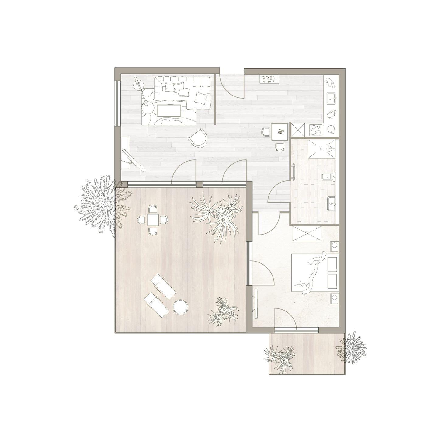 Die großzügige, möblierte Dachterrasse mit Süd-West-Ausrichtung bietet Sonne bis in den Abend hinein. Das Schlafzimmer ist mit einem komfortablen Doppelbett, Schrank und Smart TV ausgestattet. Ein Plus: ein eigener Balkon! Zudem verfügt das Apartment über ein modernes, mit anthrazitfarbenen Natursteinfliesen gestaltetes Badezimmer.