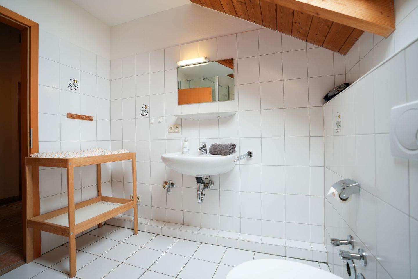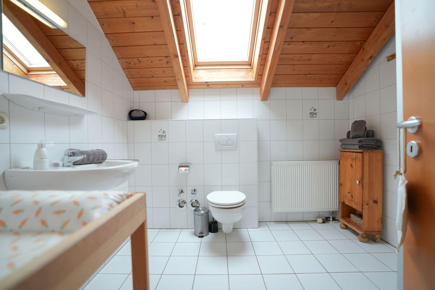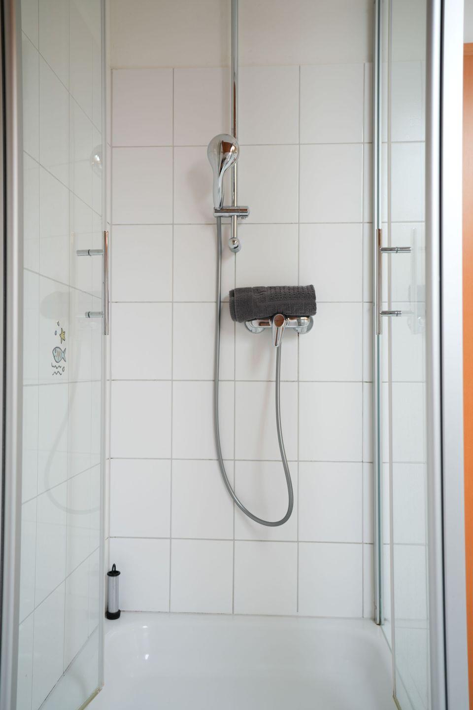 Das Badezimmer verfügt über eine Dusche mit Badewanne, WC, Waschbecken, Spiegel, Fenster und Haartrockner. Waschmaschine und Trockner können gemeinschaftlich genutzt werden.