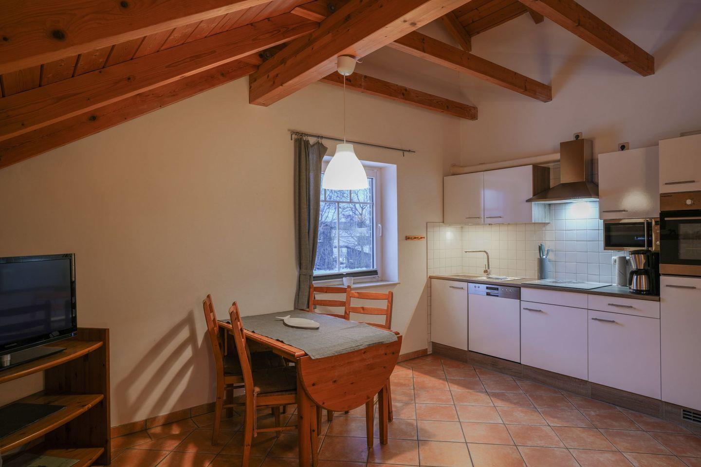 Die Küche ist vollständig ausgestattet und bietet Cerankochfeld, Backofen, Mikrowelle, Kühlschrank mit Gefrierfach, Spülmaschine, Kaffeemaschine, Wasserkocher, Toaster und Mixer. Geschirr, Besteck und Küchenutensilien stehen selbstverständlich zur Verfügung. Der Essbereich lädt zu gemeinsamen Mahlzeiten ein, während im Wohnbereich TV sowie WLAN und Internet für Unterhaltung und Komfort sorgen.
