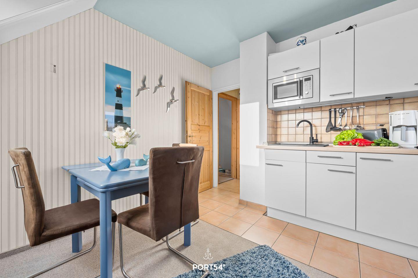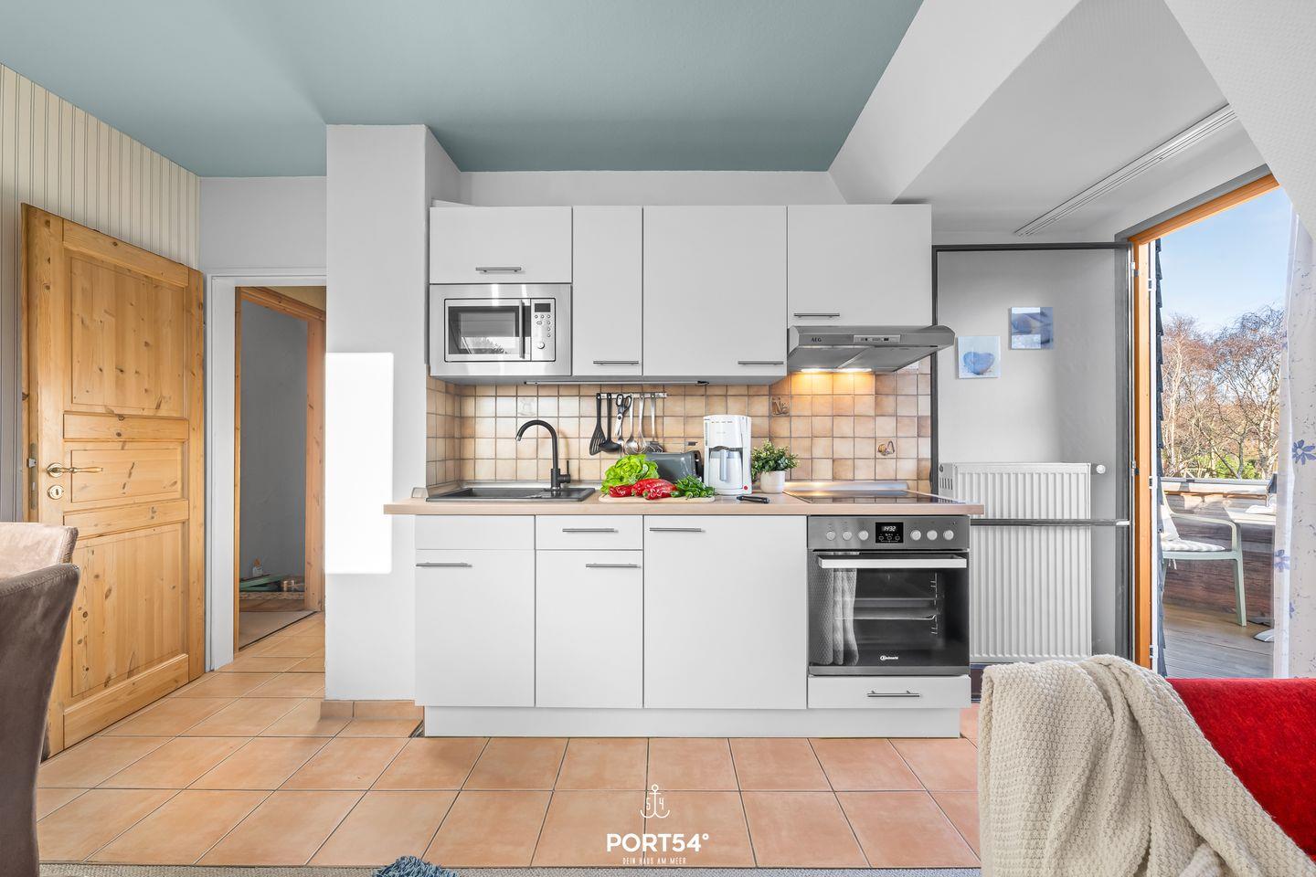 Der offen gestaltete Wohnbereich mit angrenzender Küche ist funktional eingerichtet. Die offene Küche bietet umfassende Ausstattungsmerkmale: Ceranherd, Backofen, Mikrowelle, Kühlschrank mit Gefrierfach, Kaffeemaschine, Toaster, Wasserkocher, Eierkocher sowie ein Mixer stehen ebenso zur Verfügung wie Geschirr, Besteck und vielfältige Küchenutensilien. Der angrenzende Essbereich lädt zu gemeinsamen Mahlzeiten ein.