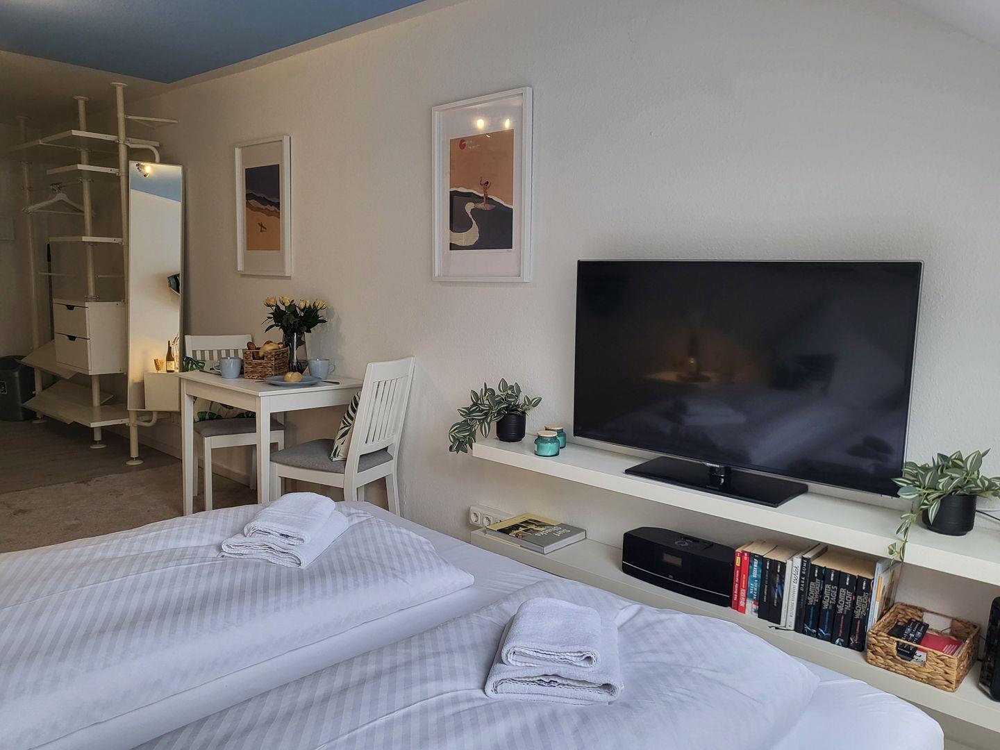 Im modern gestalteten Wohn- und Schlafraum befindet sich komfortables Doppelbett, der Esstisch sowie die in den Raum integrierte Küche. Eine Garderobe und ein Schuhschrank sorgen für zusätzlichen Komfort.