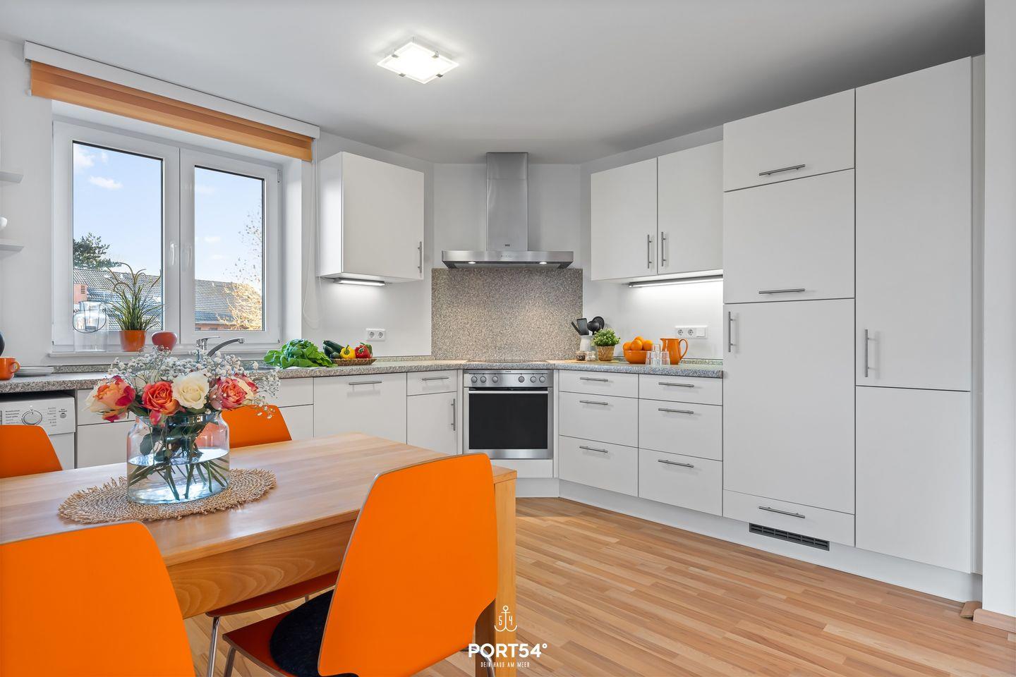 Das Herzstück der Wohnung bildet das großzügige Wohnzimmer mit einer gemütlichen Sofaecke, Sessel, Satelliten-TV, DVD-Player und einer Auswahl an Büchern sowie Gesellschaftsspielen. Ein Esstisch im offen gestalteten Wohn- und Essbereich schafft einen angenehmen Rahmen für gemeinsame Mahlzeiten. Die offen zum Wohnzimmer gestaltete Küche ist mit modernen Einbaugeräten wie Ceran-Herd, Backofen, Spülmaschine, Kühlschrank mit Gefrierfach, Mikrowelle, Kaffeemaschine, Wasserkocher, Toaster, Sandwichmaker, Mixer und umfassenden Küchenutensilien ausgestattet. Warme Getränke lassen sich unkompliziert zubereiten und auch anspruchsvolles Kochen ist in dieser gut ausgestatteten Küche problemlos möglich.