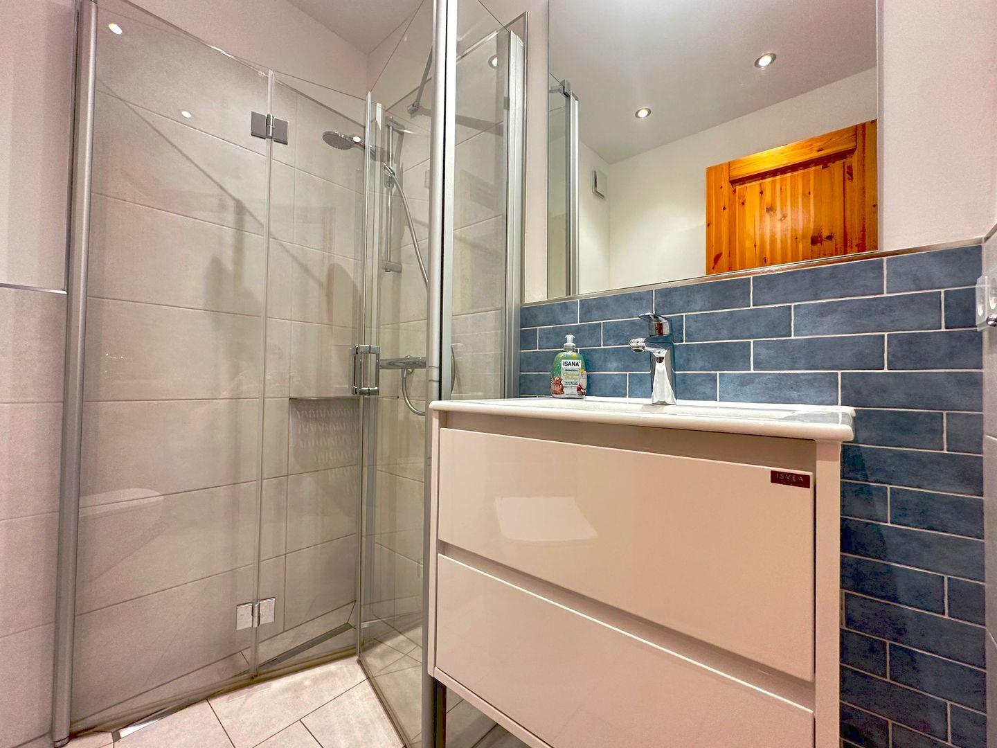 Das moderne Duschbad überzeugt durch zeitgemäße Ausstattung und Komfort. Die ebenerdige Dusche ermöglicht einen bequemen Einstieg.