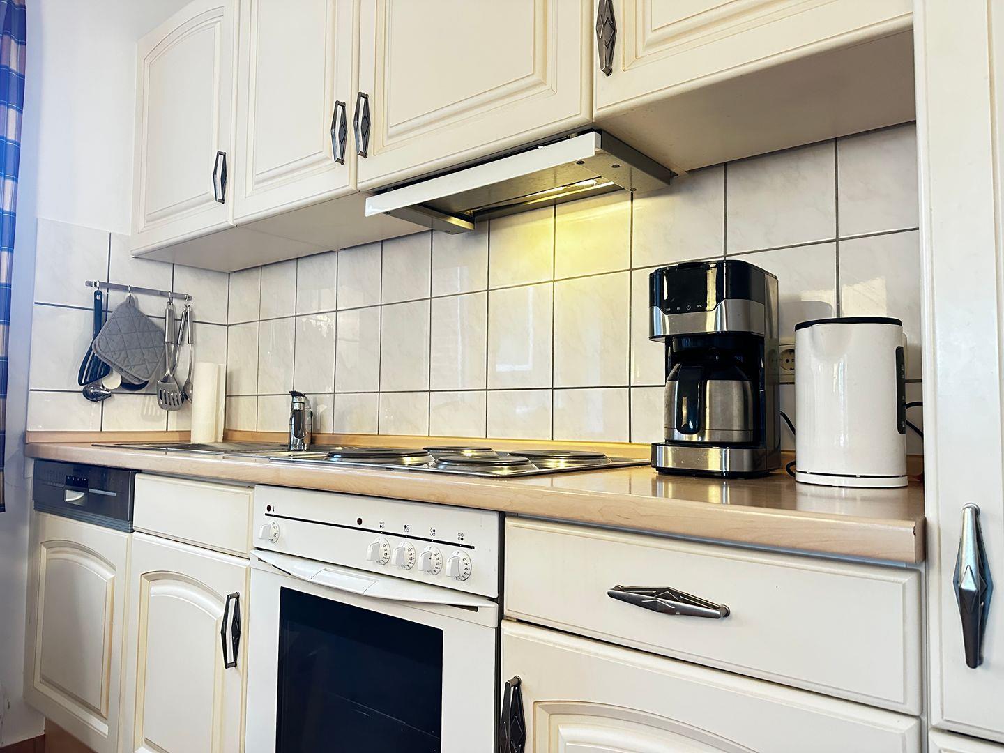 Die geschlossene Küche ist gut ausgestattet und verfügt über einen 4-Platten-Herd, eine Spülmaschine sowie einen Essbereich für gemeinsame Mahlzeiten.