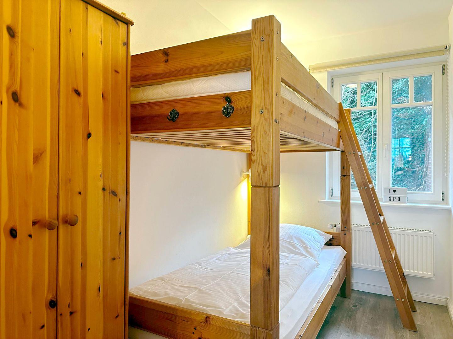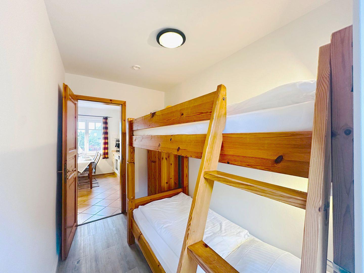 Zwei getrennte Schlafzimmer stehen den Gästen zur Verfügung: eines mit einem komfortablen Doppelbett, das zweite mit einem Etagenbett. Beide Schlafzimmer sind mit Verdunklungsmöglichkeiten sowie einem Kleiderschrank ausgestattet und bieten somit angenehmen Schlafkomfort.