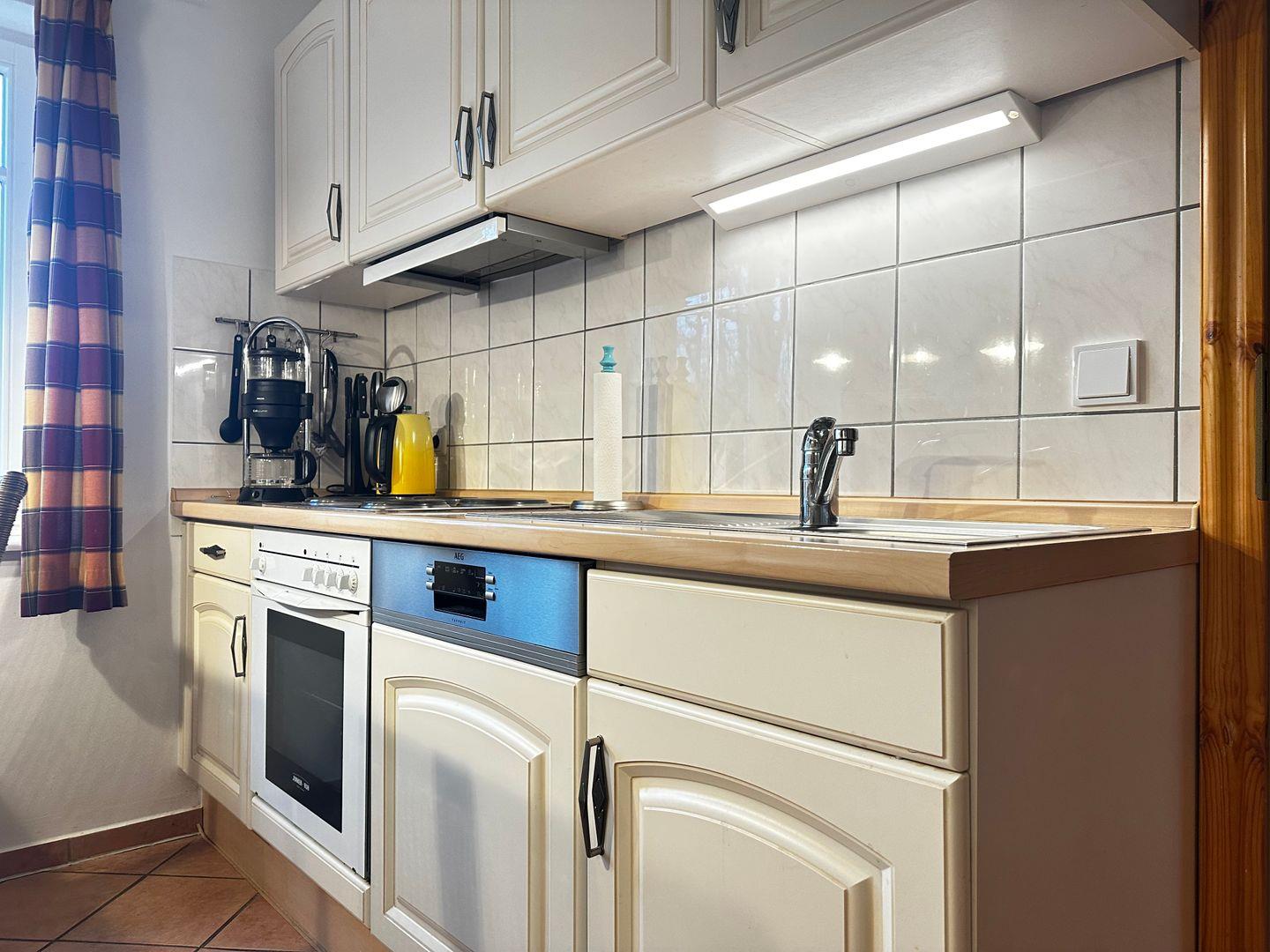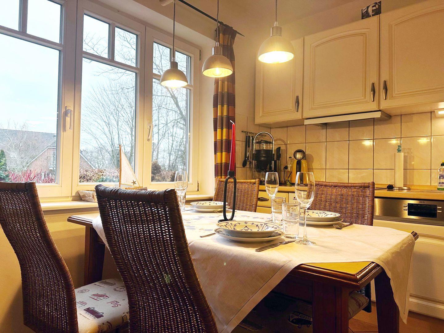 Die separate Küche ist funktional und gut ausgestattet. Sie verfügt über einen 4-Platten-Herd, einen Geschirrspüler, einen Kühlschrank, eine Mikrowelle sowie einen Essbereich für gemeinsame Mahlzeiten.
