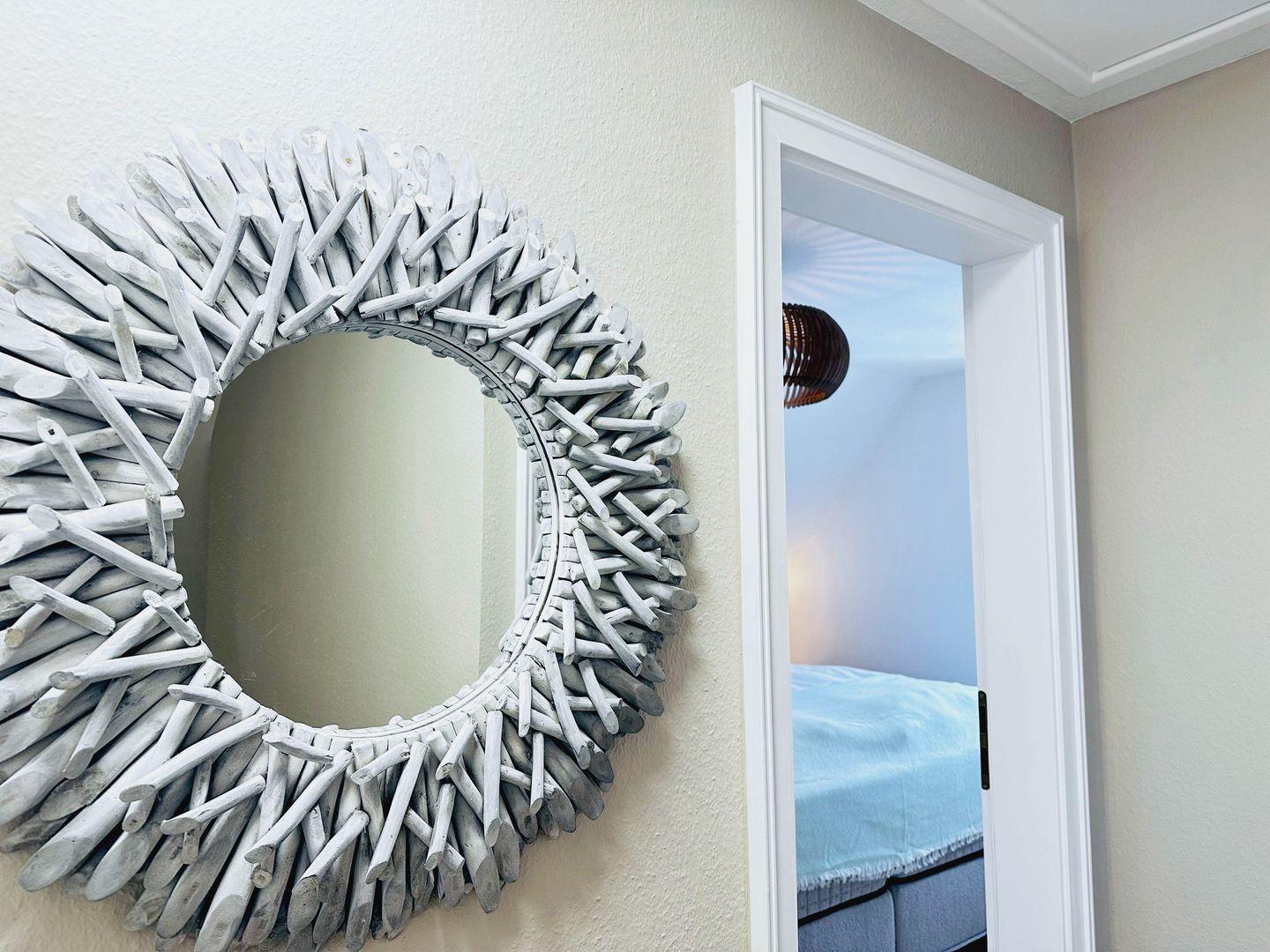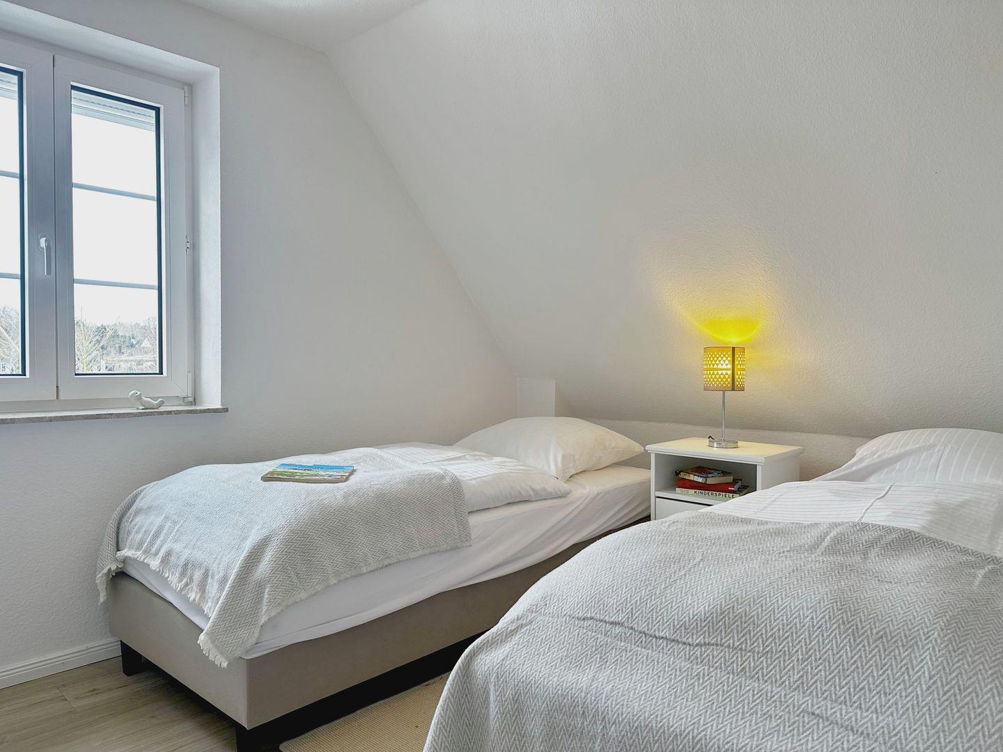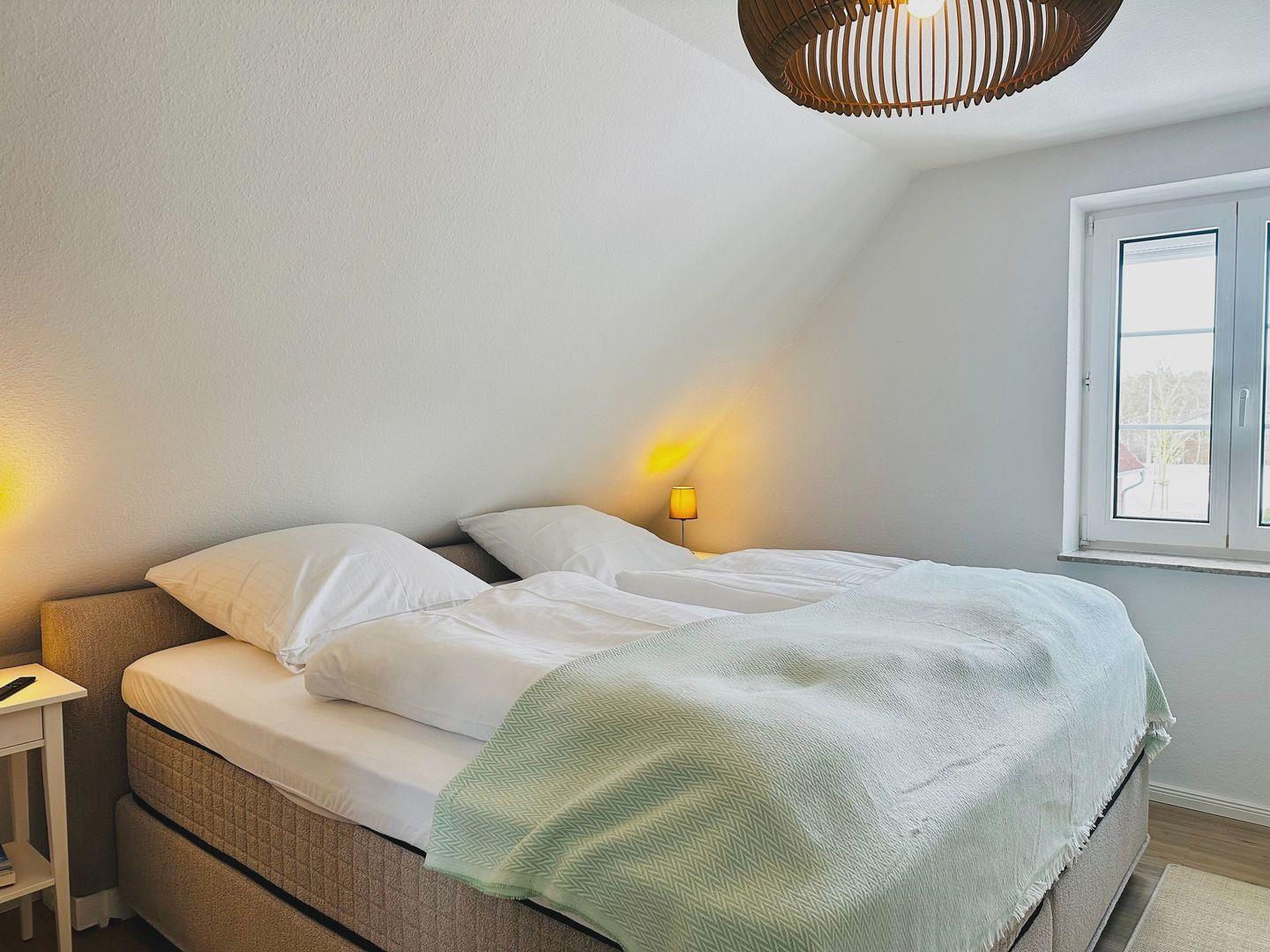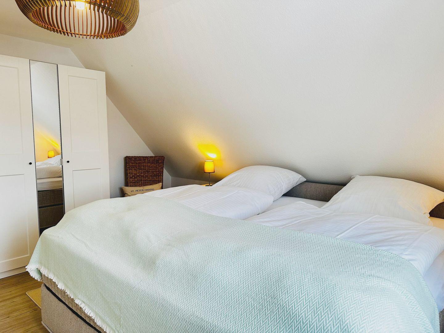 Über eine geschlossene Treppe gelangen Sie ins Obergeschoss. Dort erwarten Sie zwei Schlafzimmer mit bequemen Boxspringbetten. Beide Zimmer verfügen über Kleiderschränke, Verdunklungsmöglichkeiten und Fernseher.