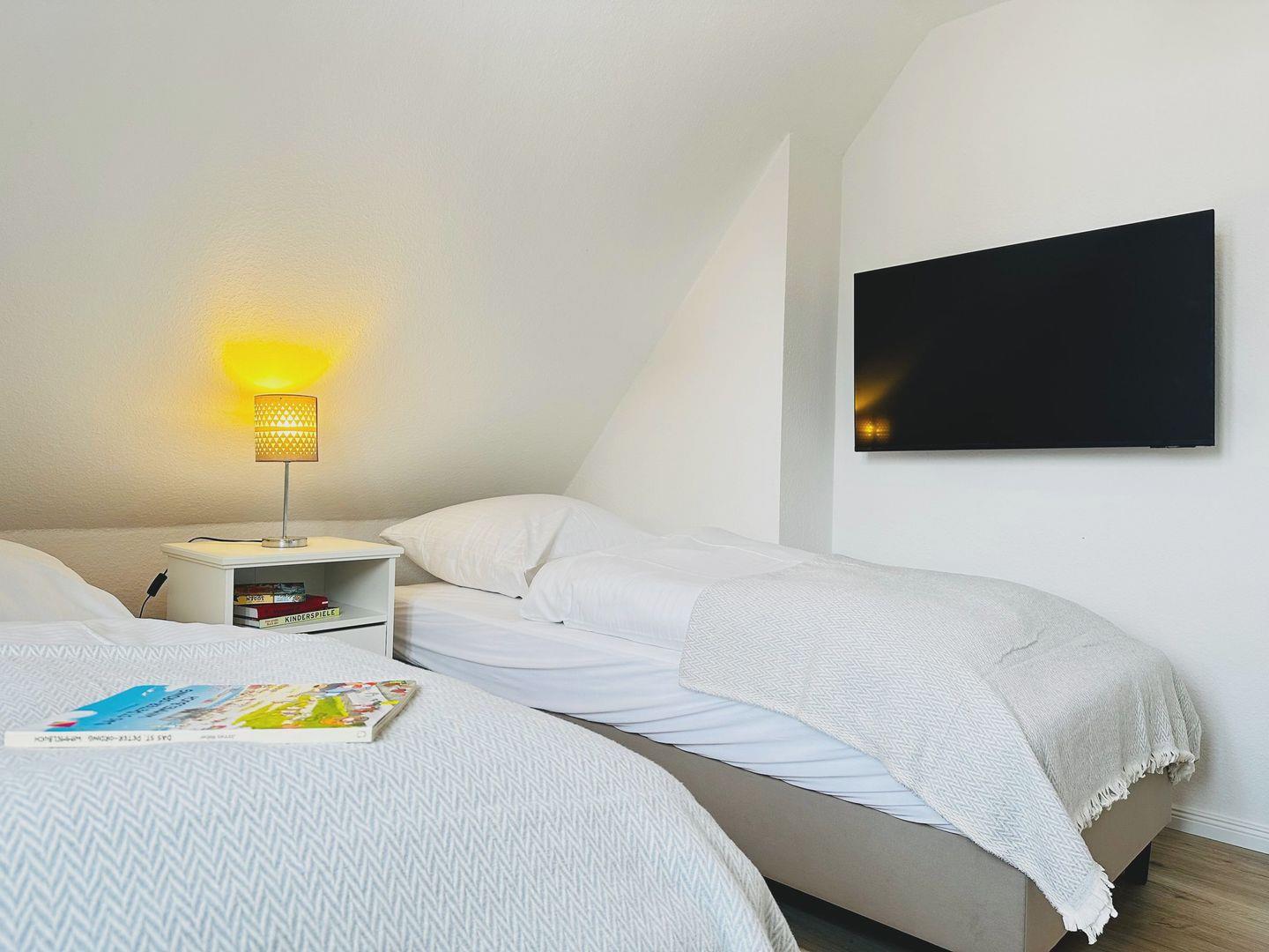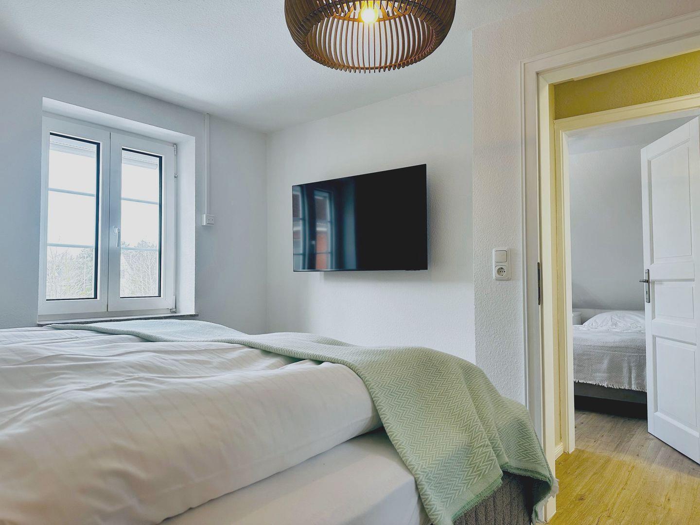 Zwei Schlafzimmer im Obergeschoss, jeweils mit Kleiderschrank, Verdunklung und TV.