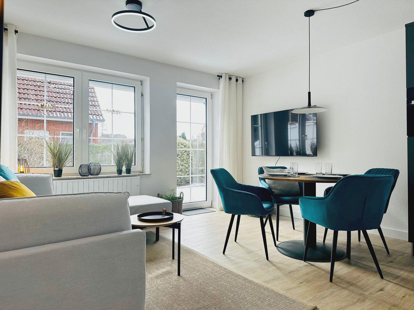 Auf etwa 55 m² bietet das Haus drei Zimmer sowie einen offenen Wohn- und Küchenbereich, der modern und gemütlich eingerichtet ist. In der Küche finden Sie alles, was Sie für den Alltag brauchen, darunter Geschirrspüler, Kombi-Backofen mit Mikrowellenfunktion, Cerankochfeld, Kaffeemaschine und Wasserkocher.