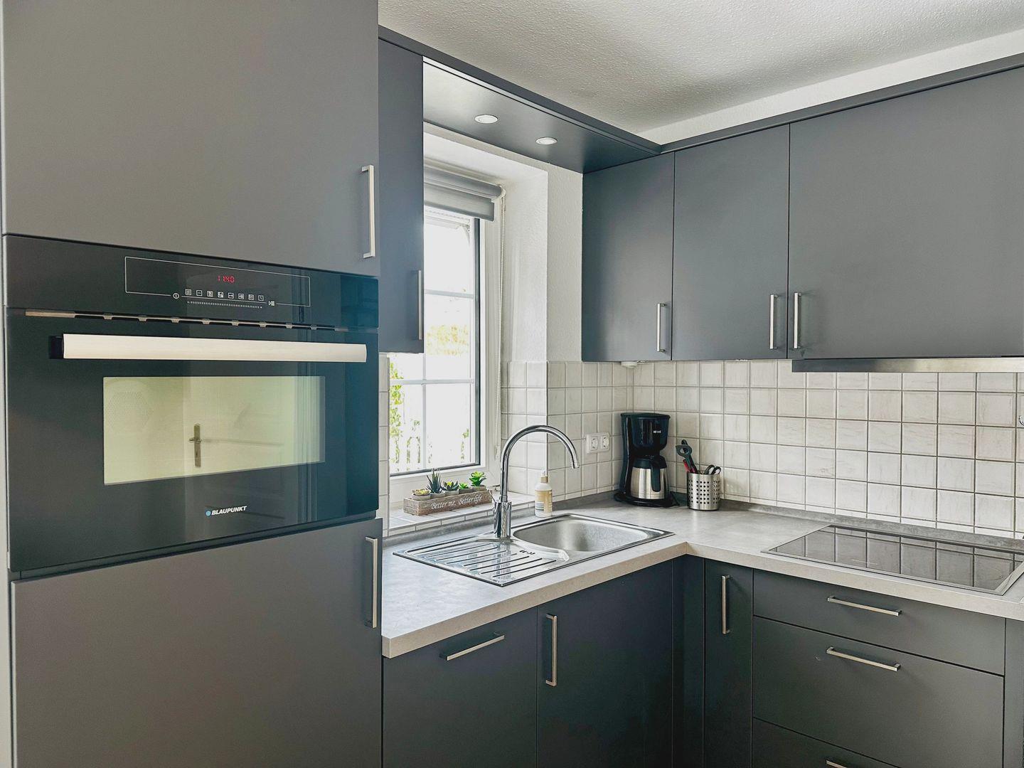 Charmantes Reihenendhaus mit ca. 55 m², 3 Zimmern und offenem Wohn-/Küchenbereich. Moderne Küche mit Geschirrspüler, Backofen, Cerankochfeld sowie Kaffeemaschine, Wasserkocher und Toaster.