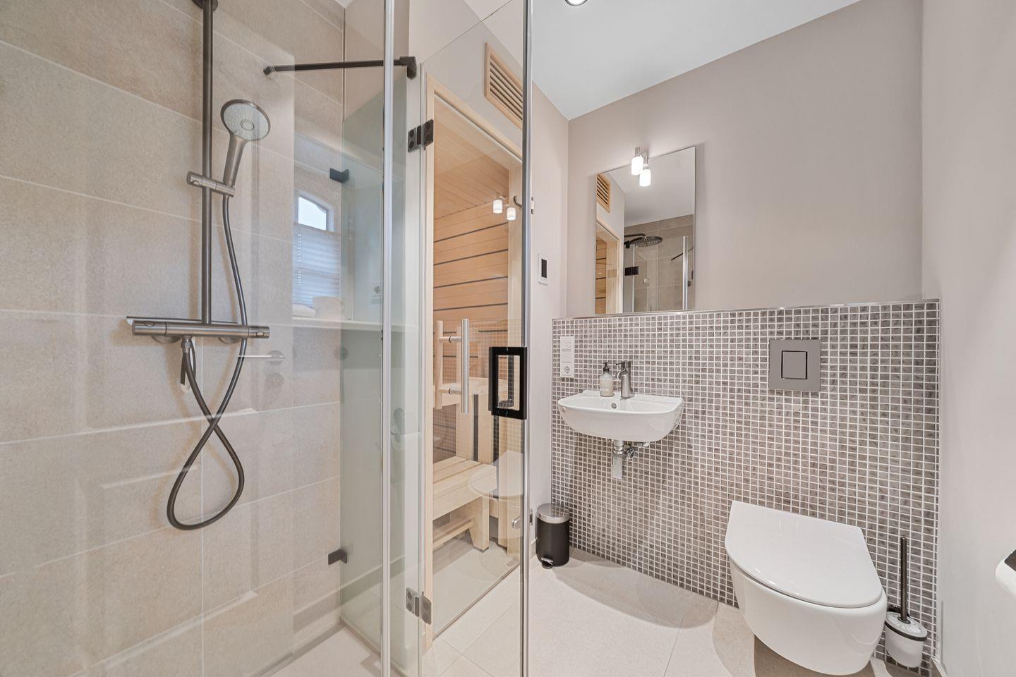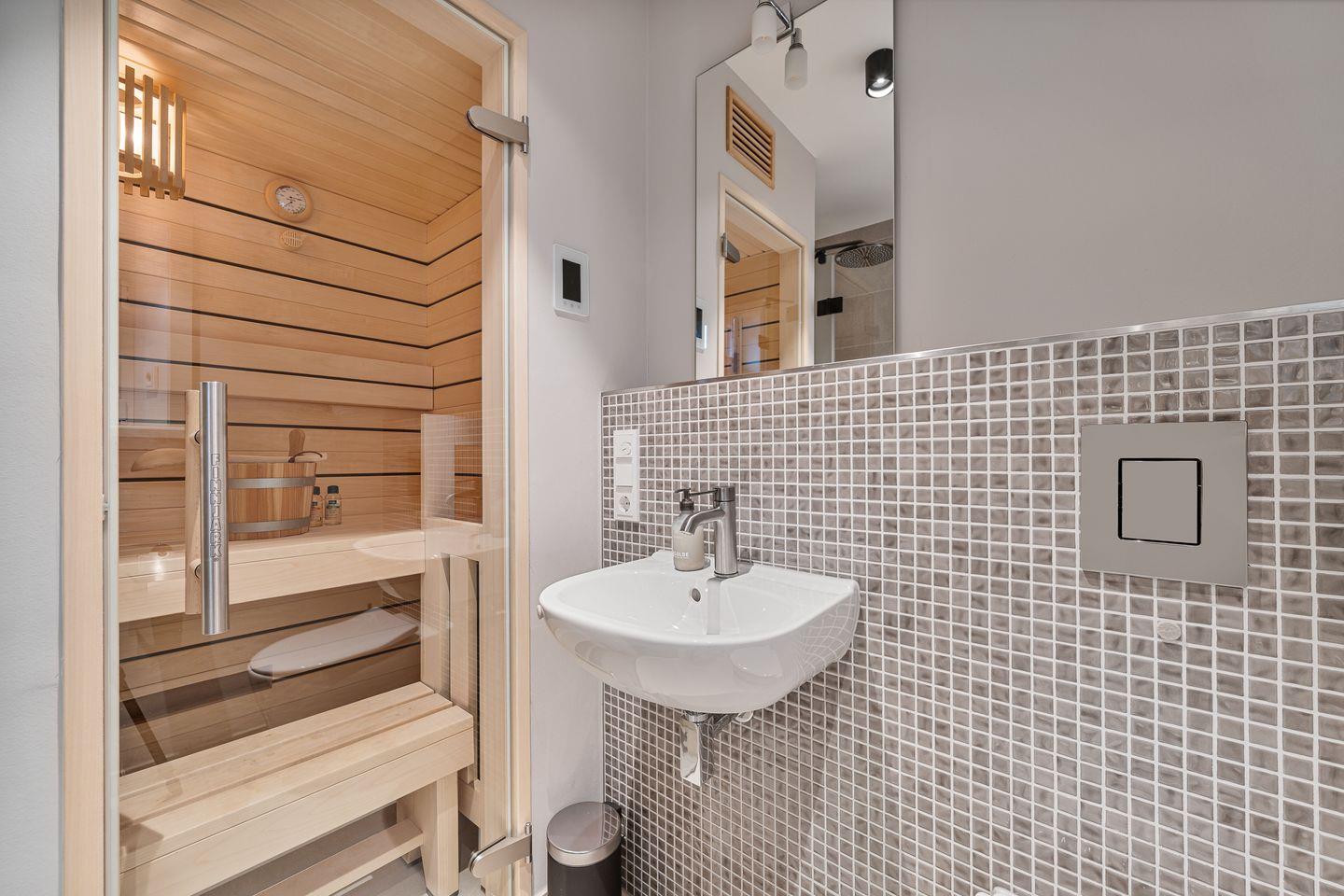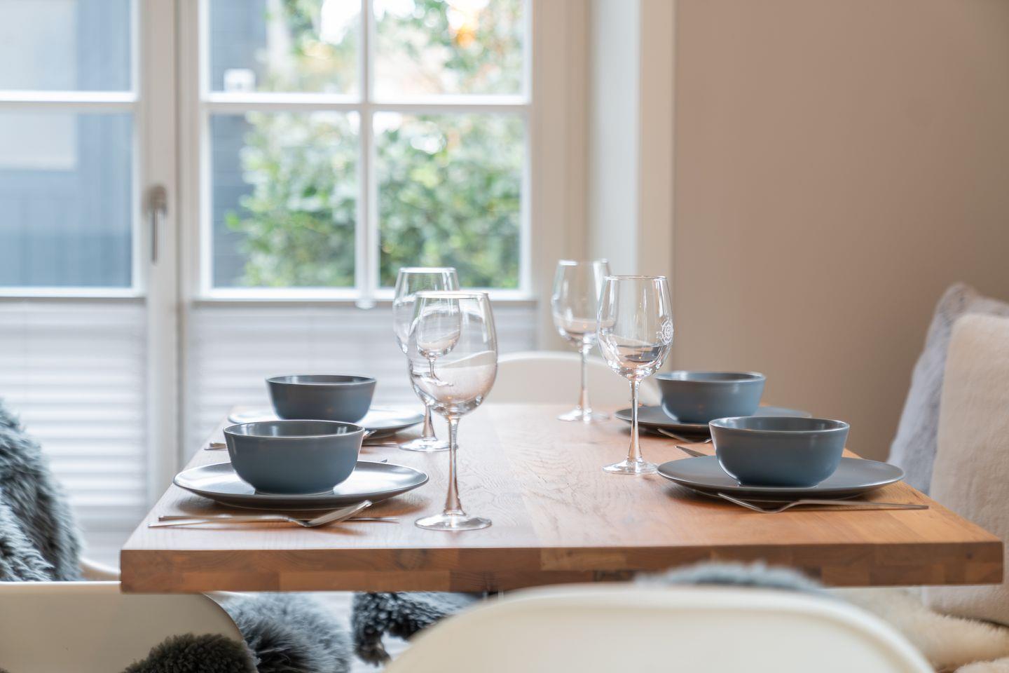 Im Erdgeschoss befindet sich der lichtdurchflutete Wohnraum mit TV, Gaskamin, einer offenen Küche sowie einem stilvollen Essbereich mit Terrassenzugang. Die Küche ist mit hochwertigen Elektrogeräten ausgestattet.