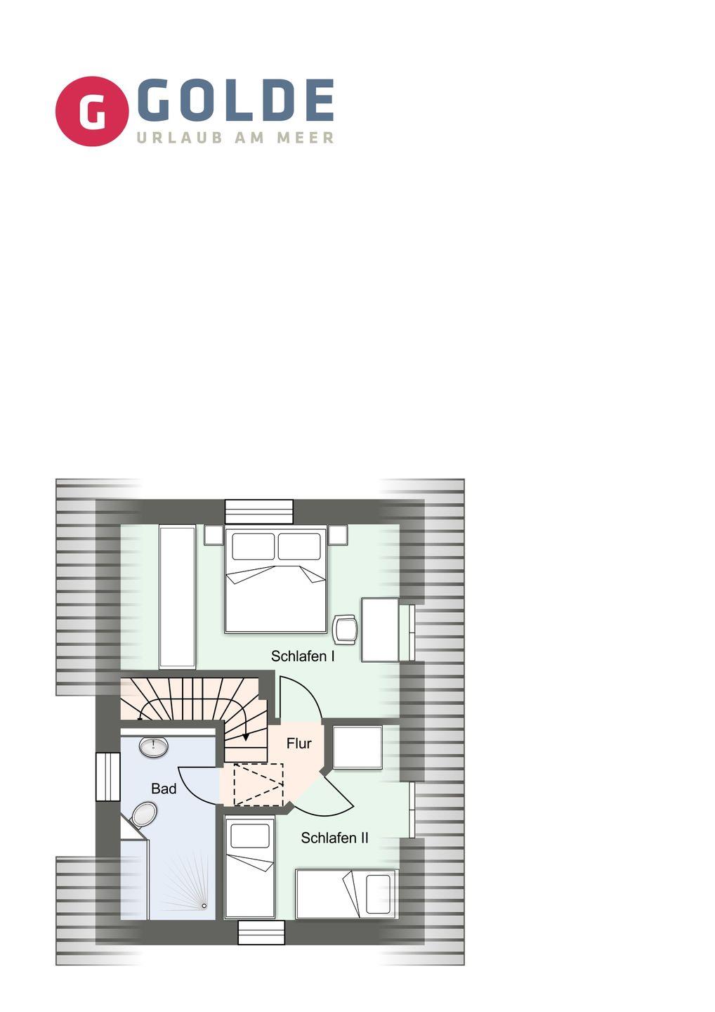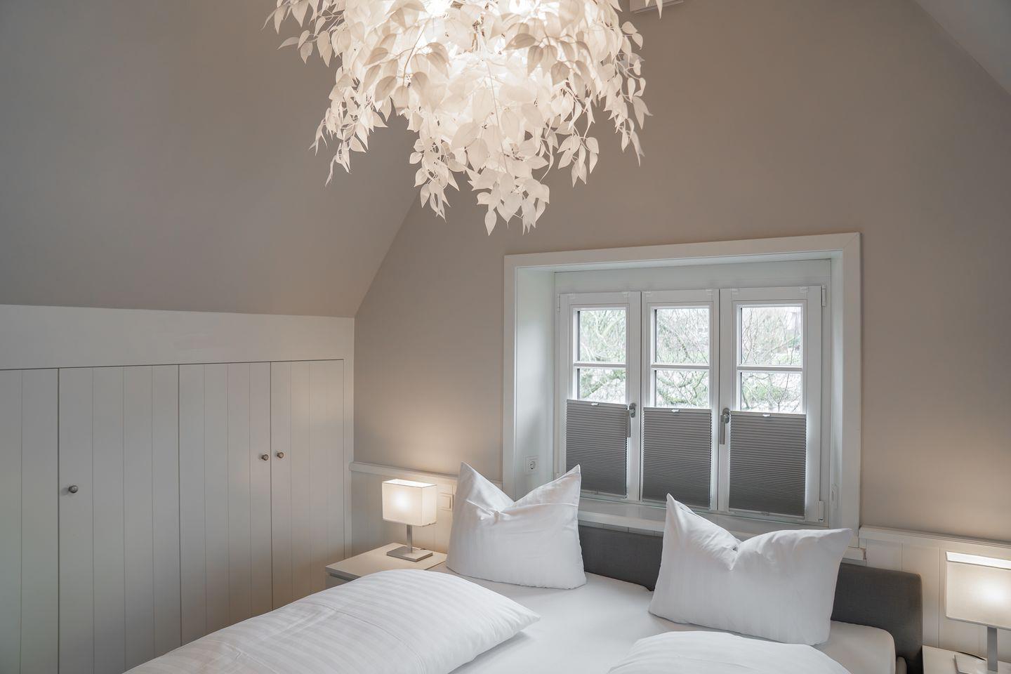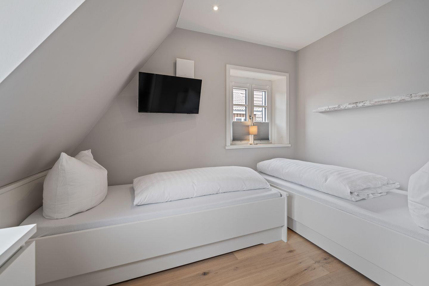 Über eine Holztreppe gelangt man in das Obergeschoss mit einem weiteren Duschbad und zwei Schlafzimmern. Eines mit einem Doppelbett und eines mit zwei Einzelbetten.