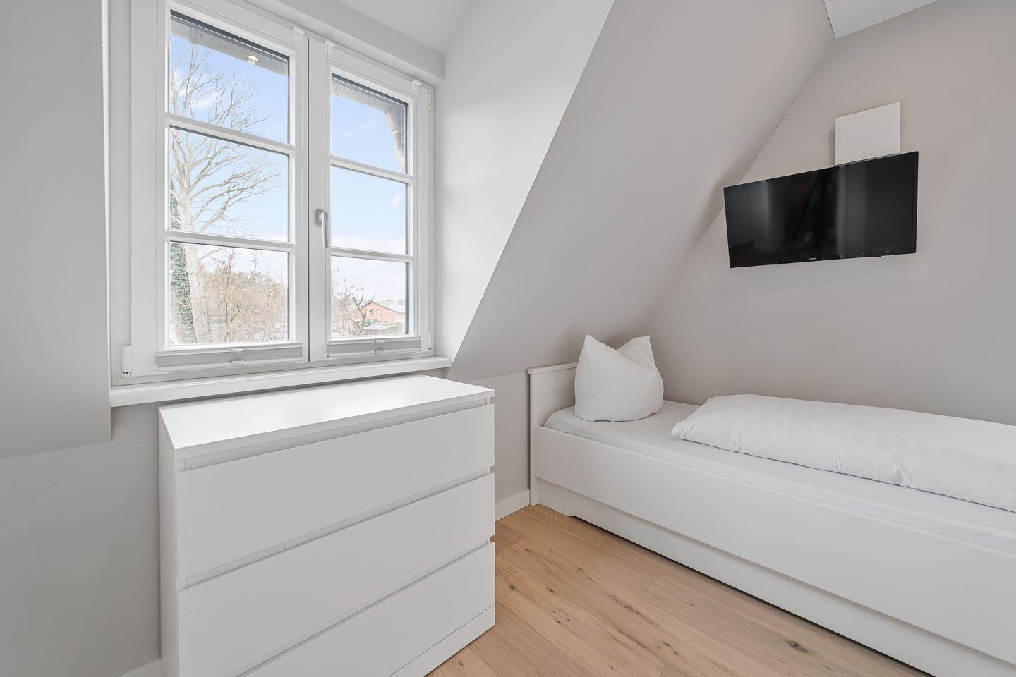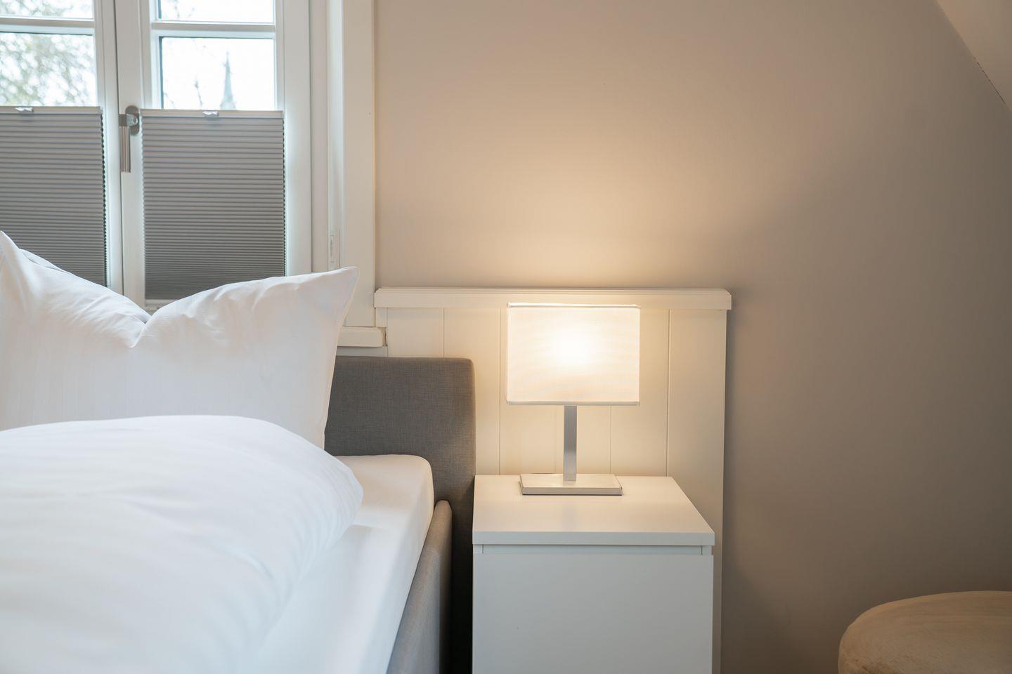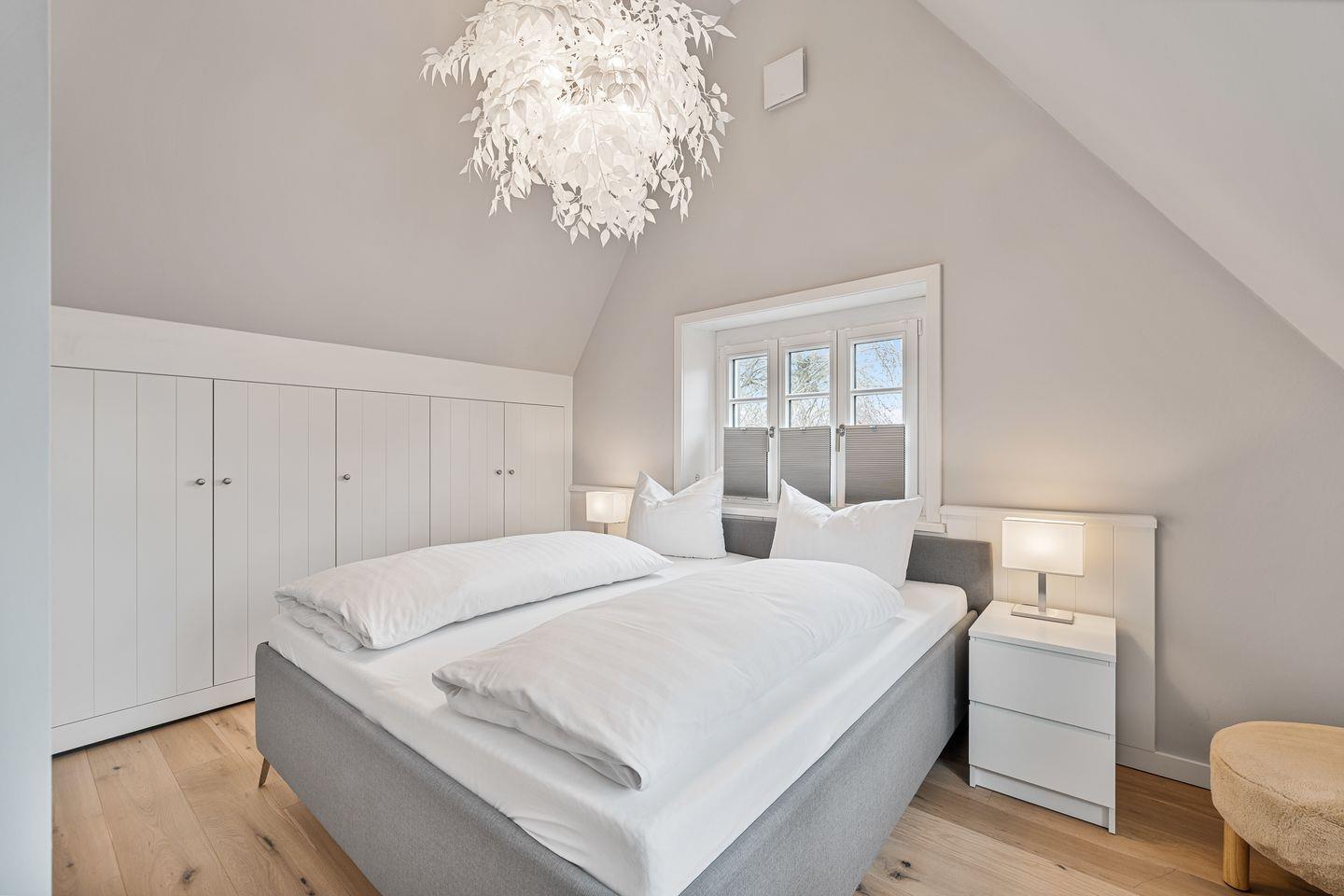 Über eine Holztreppe gelangt man in das Obergeschoss mit einem weiteren Duschbad und zwei Schlafzimmern. Eines mit einem Doppelbett und eines mit zwei Einzelbetten.